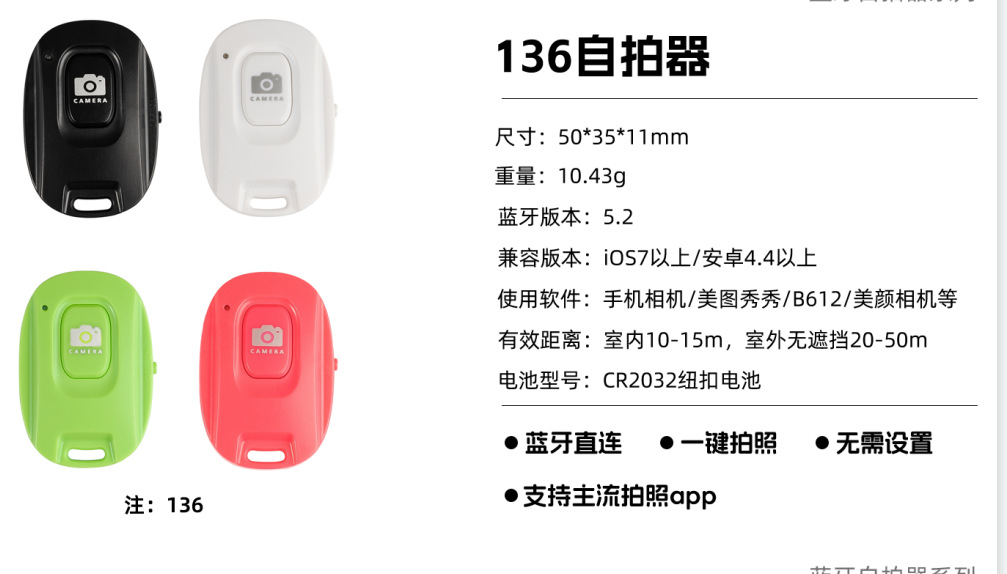 一:手机蓝牙自拍遥控器默认蓝牙版本为5.2,可以定制蓝牙版本为3.0
