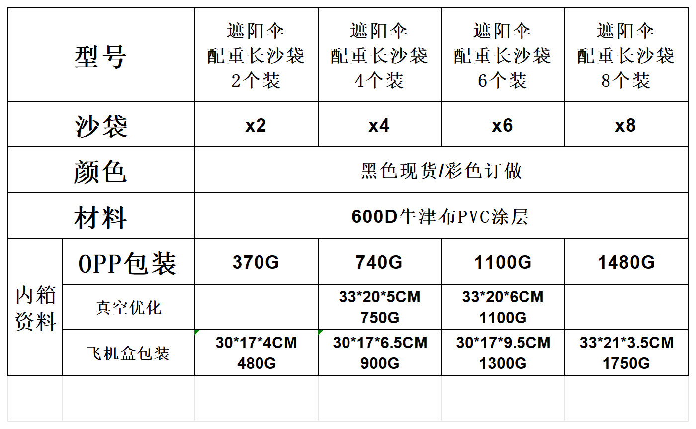 ![]() | Black(30*72.5cm) | Parasol base weighted sandbags 2 pack | ¥19.8 / ≈ 239 ₽ | 2560 | 5919506383803 | |