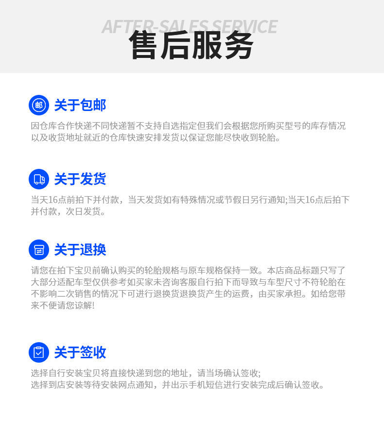 购物须知:本店商品标价,都是不包括税点,开票另加税点,详情咨询客服。 部分商品及偏远地区(例如:新疆、西藏、香港、澳门、台湾等地区)无法包邮,详情请询问客服修改运费,部分商品为预售款页面价格为预付定金,下单前请与客服联系确认,部分商品款式或与页面图片有些许不同,请您下单前与客服确定规格款式,以免给造成误会,给您带来的不便敬请谅解!轮胎运费较高,收获前请检查仔细,如有问题第一时间联系客服,如未联系默认质量完好,如有退货请承担相关运费。