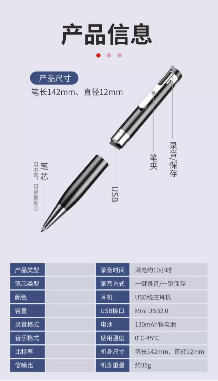 Список упаковки Recording pen/charging cable/headphones/pen refill