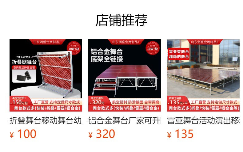 1.折叠舞台定做尺寸100元每平方,常规尺寸按块卖122x122cm的150元/块 128x128的160元每块 100x150 200元每块 100x200cm240元每块 其它尺寸也有,量大批发价,咨询优惠价