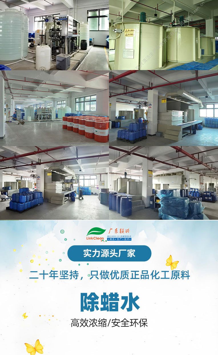 【配制方法】取2/3槽体积的干净水置于槽中,加热至50-60℃左右,加入所需的除蜡剂,充分搅拌均匀后补加余量的水。升温至所需的工作温度。