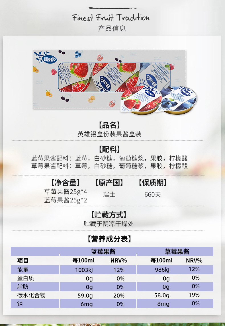 📦 | Hero aluminum box portion jam 150g*1 box | 1шт: ¥19.90, 3шт: ¥18.90, 12шт: ¥17.90 | 980 | 5766068093802 |