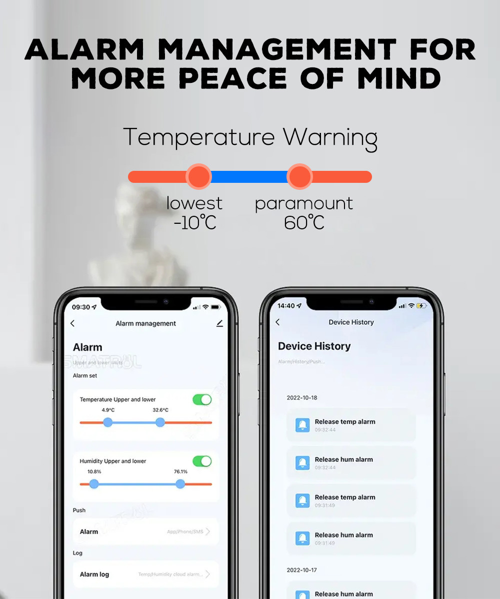 [高湿度低湿度报警]:一旦超过设置的湿度的数值,手机会提示报警