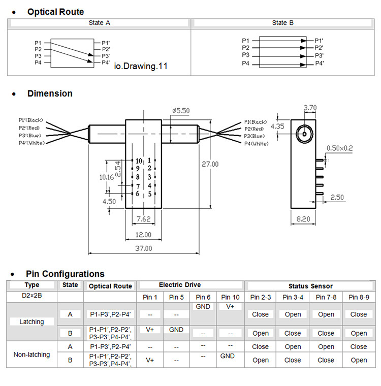 Механический переключатель с сохранением поляризации D2×2B управление оптическим путем одномодовый многомодовый незащелкивающийся 1310/1550/850Nm