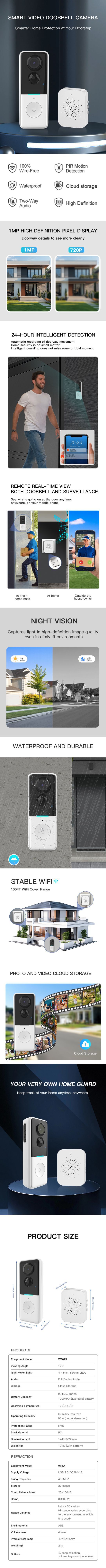 Видеодомофон с Wi-Fi, 100W пикселей, поддержка PIR-обнаружения, удаленный вызов и интерактивная связь