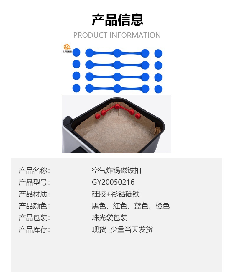 品名:空气炸锅磁铁扣颜色:红色、黑色、蓝色,橙色(也可定制颜色)