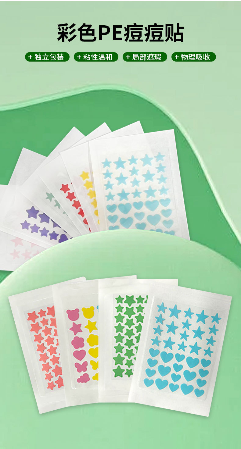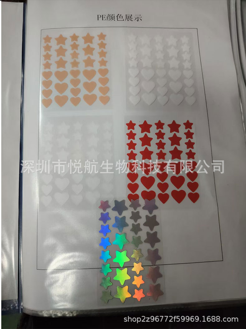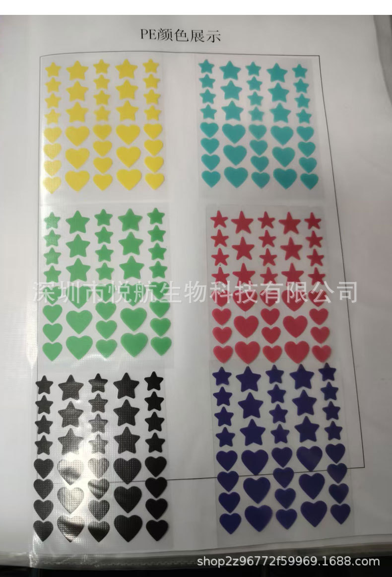深圳悦航生物专业生产痘痘贴,规格齐全:星星款��爱心款、圆形水胶型款、PE人工皮款,薄款厚款,12粒,24粒,36粒,40粒等多种规格组合,排列,可按客户要求定制,另外还有彩印痘痘贴,压边,异形款可散装发货也可包装整套发货。