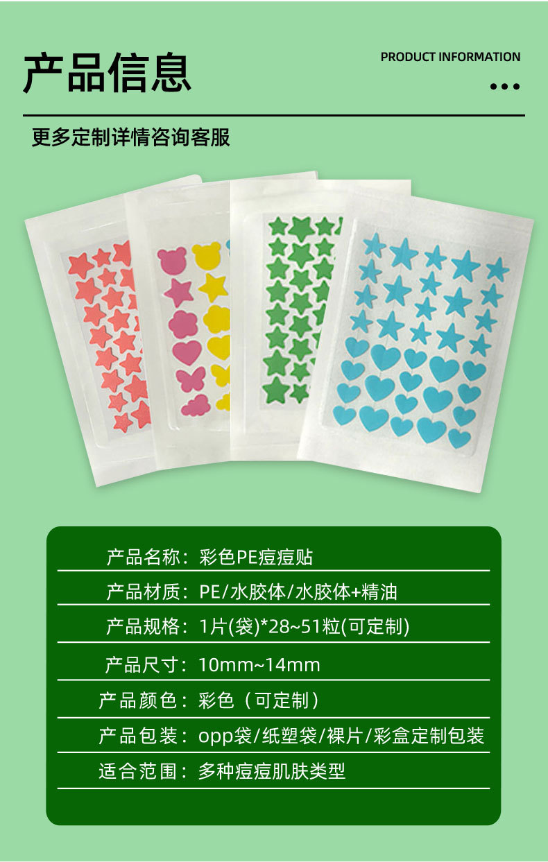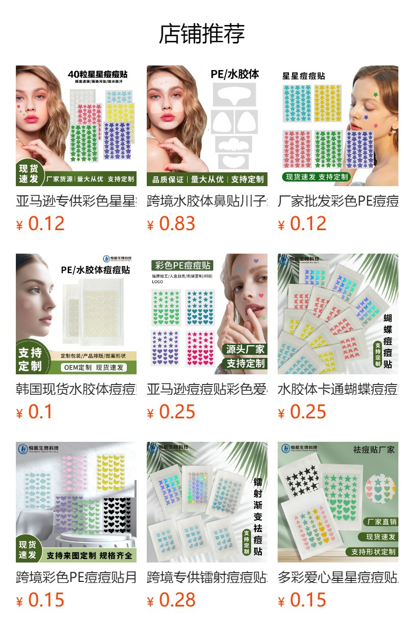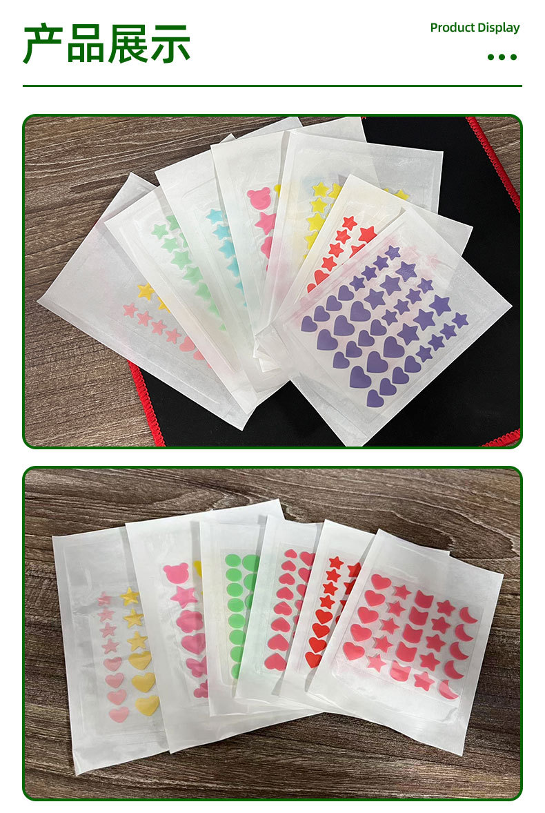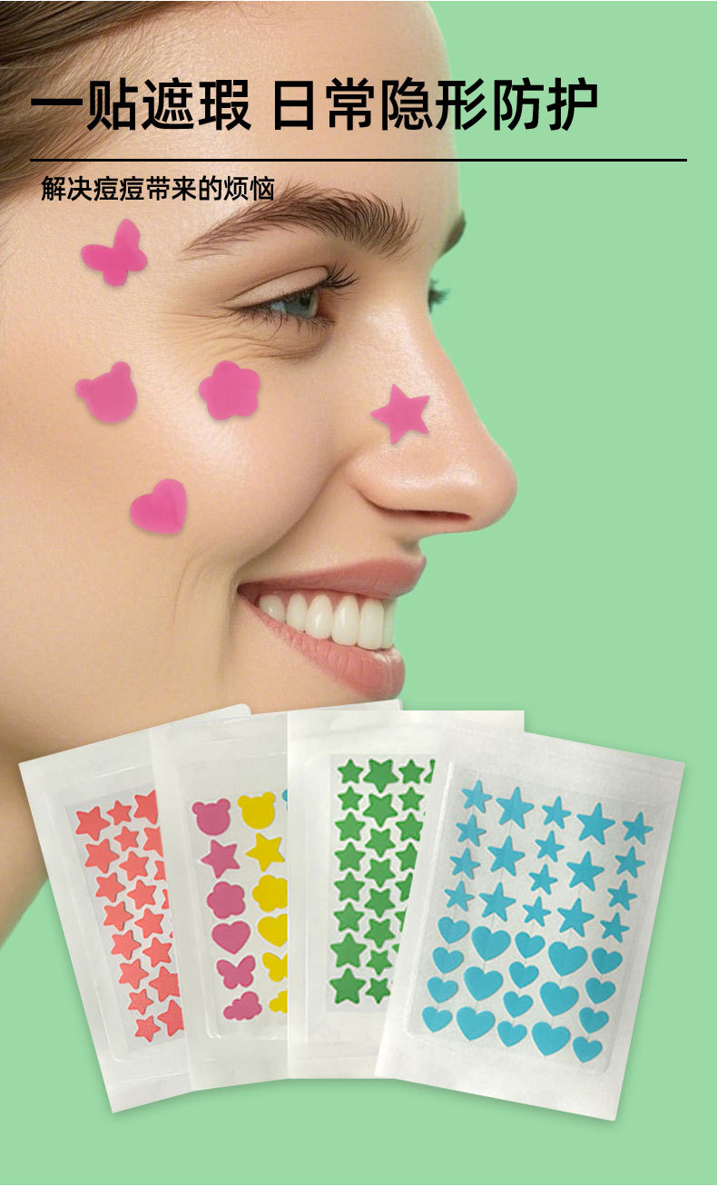 深圳悦航生物专业生产痘痘贴,规格齐全:星星款��爱心款、圆形水胶型款、PE人工皮款,薄款厚款,12粒,24粒,36粒,40粒等多种规格组合,排列,可按客户要求定制,另外还有彩印痘痘贴,压边,异形款可散装发货也可包装整套发货。