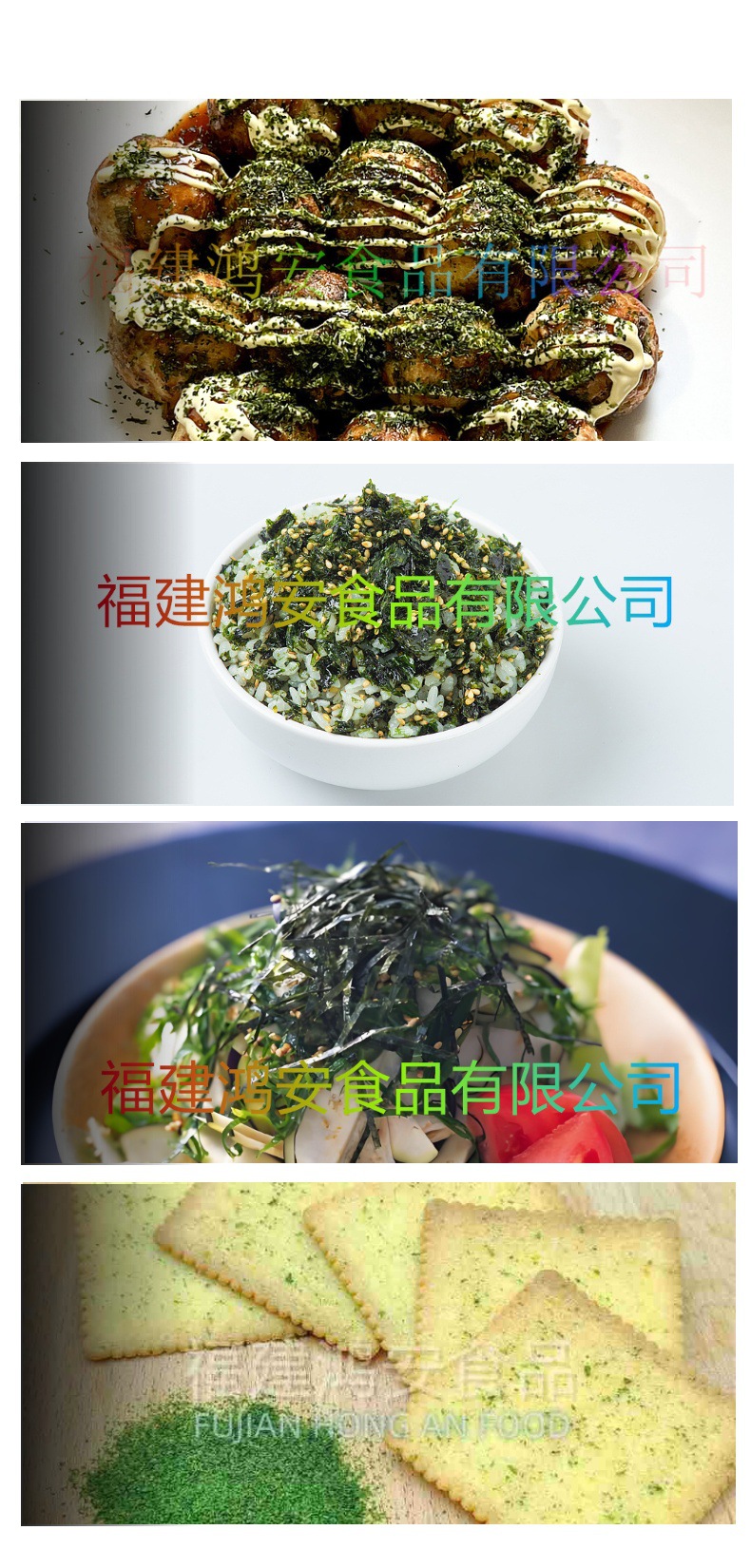 本公司是一家专注于海藻类食品研发生产与销售,主要产品:(青海苔、紫菜、海带、烤海苔、红皮藻、裙带菜、海带芽),我们始终秉持着“绿色、健康、美味”的经营理念,为广大消费者提供高质量的海藻产品。我们根据各种藻类的不同特性,采用专业的清洗、干燥、筛选、杀菌、包装等方式加工生产。