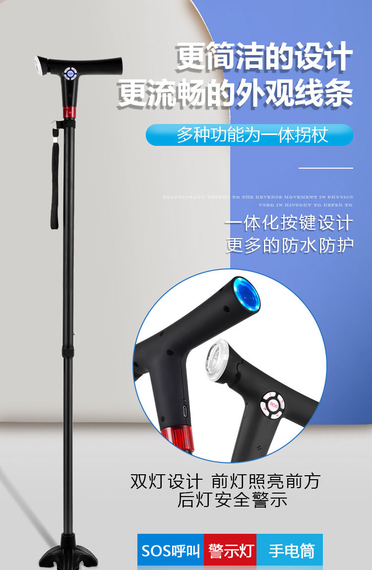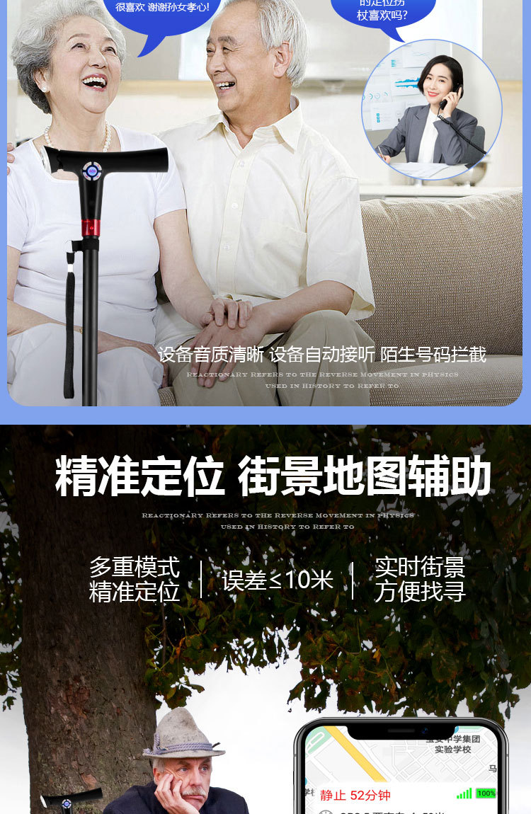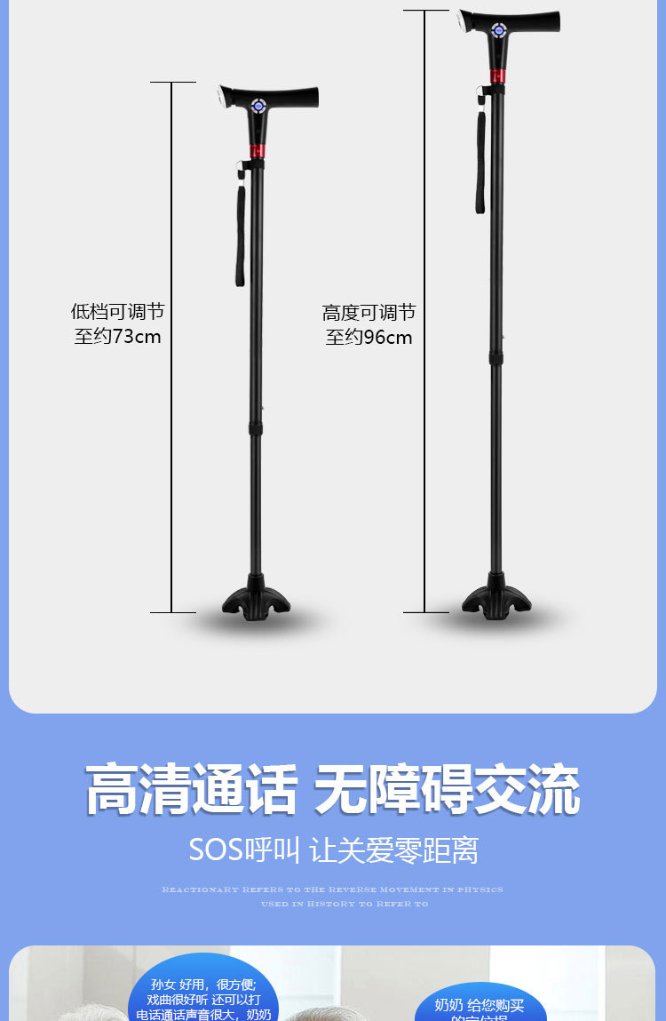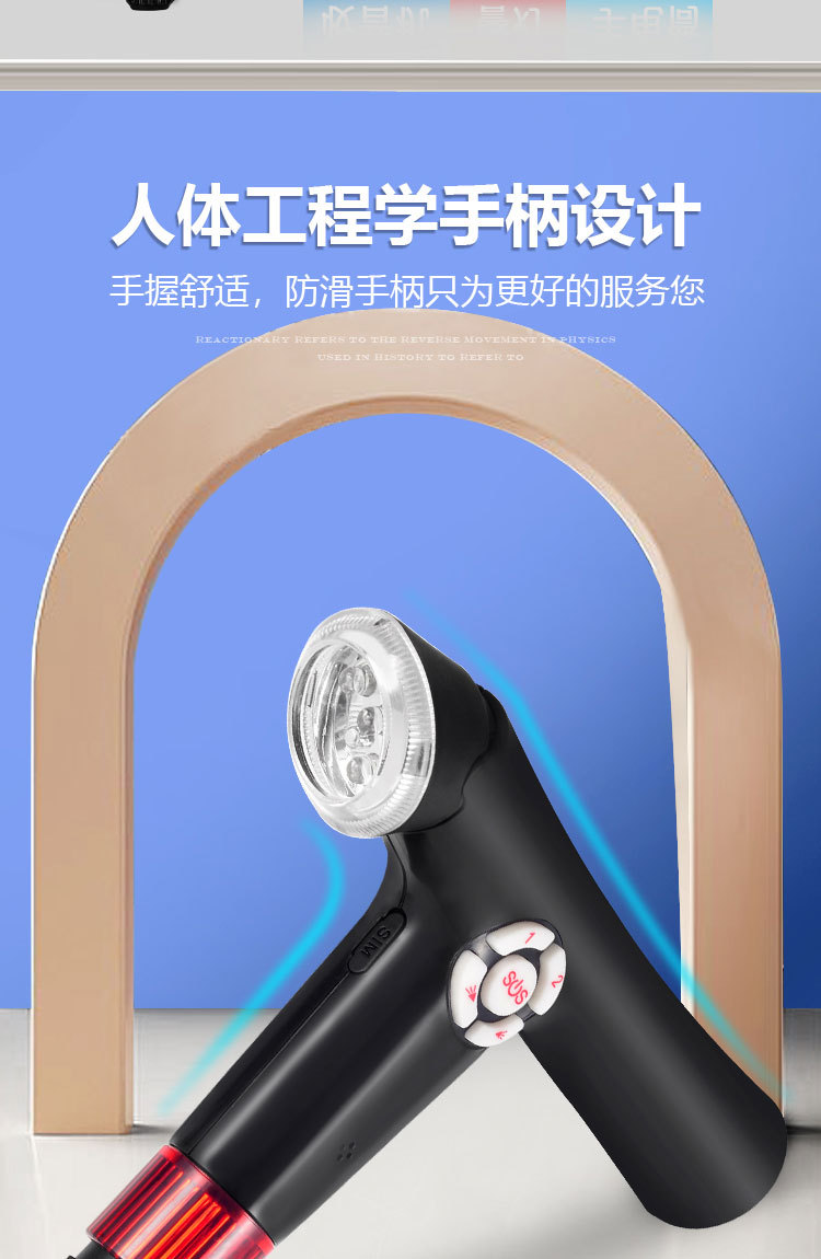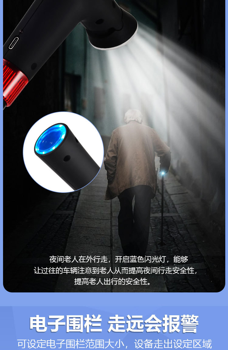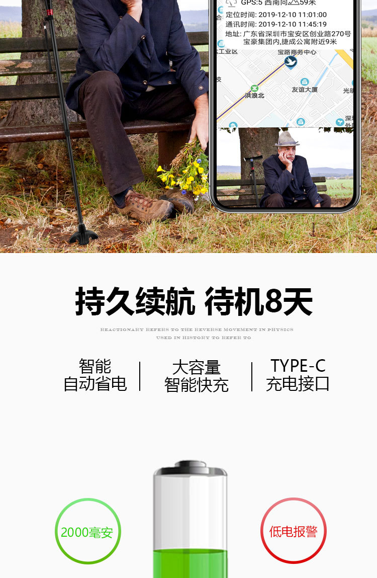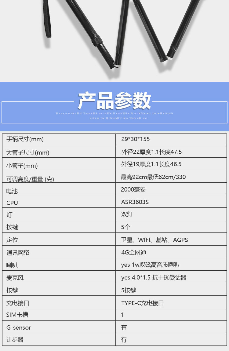 ID 材料 ABS手柄+铝合金管子 镜片 手电筒镜片PVC 按键,挂绳 软硅胶按键,挂绳松紧带 颜色 桃木纹手柄(或黑色)+管子乌黑雾面氧化 尺寸 手柄尺寸 (mm) 29*30*155 大管子尺寸(mm) 外径22 厚度1.1 长度47.5 小管子 (mm) 外径19厚度1.1长度46.5 可调高度/ 重量.克 最高92cm 最低62cm/ 330 蓝牙 版本4.0 支持10米内无障碍物 防水等级 不防水 电池 最大充电电压 5.0V 容量 2600mAH 待机时间 7-12天 通话时间 9-10小时 充电接口 TYPE-C 华为手机充电口 电池电压 3.8V 外形规格 18650 多媒体 蓝牙 连接名称:智能拐杖 版本4.0 范围10米内 收音机 FM调频 频段87-108MHz 支持插内存卡(内置) TF卡最大支持32G 报警(手动+自动) 红光闪烁+报警声音100db 蓝牙通话 不支持(可扩展) 充电接口支持连接电脑更新资料 连接电脑可当外接音箱 照明 灯珠 1瓦单灯珠 连续使用8-9小时 通讯 芯片 8910SS GPRS Class 12 声音 铃声 yes 免提 Yes 喇叭 外径26mm0.5-1W 麦克风 yes 4.0*1.5 抗干扰受话器 其他 按键 Yes(一键SOS 4G版本一键报时 2G不支持) 指示灯 高亮度LED灯 端口 耳机接口 NO 充电接口 TYPE-C 华为手机充电口 SIM卡槽 1 NANO SIM IO 端口 2pin 摄像头 无 防跌倒 跌倒报警 支持(跌倒报警10秒内未停止启动SOS电话) 其他 天线 内置FPC GSM天线 计步器 NO 通讯网络 GSM B2 B3 B5 B8 TDD-LTE B1 B3 B5 B8 FDD-LTE B38 B39 B40 B41 GPS GPS芯片 支持 WIFI WIFI定位 支持 App端(IOS+安卓) 双向通话 支持双向通话,并且屏蔽其它骚扰电话 微聊 无 远程监听 支持回拨模式远程监听(通过高抗噪麦克风可清晰的远程听到对方的环境声音) 搜星频率设定 可设定1分钟、10分钟、30分钟、及卫星关闭手动搜星,用户可以根据自己需求自主掌控 电子围栏 可设定多个电子围栏 心律血压测试 无 消息提醒 可提醒进出电子围栏状态、电池电量低或充满状态 多个拐杖添加 可在1个app中添加多个拐杖 历史轨迹查询 可查询1个月时间范围内的历史轨迹 历史轨迹播放功能 可自动播放轨迹 WIFI定位+GPS定位+基站辅助定位 wifi定位精度3-50米,GPS定位精确度可达到3~10米、LBS精确度可达到100~500米范围 电池电量监控 可随时知道拐杖电池电量 网络自动为腕表校时 绑定后腕表自动与网络时间同步