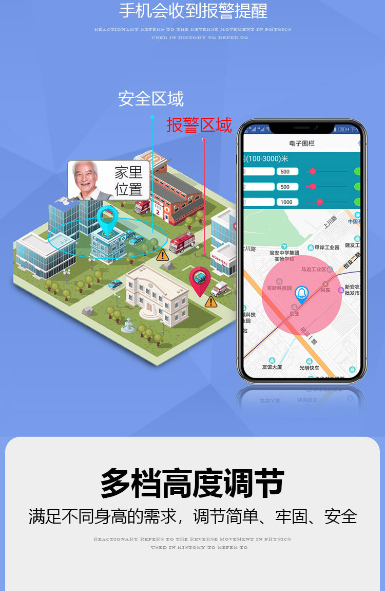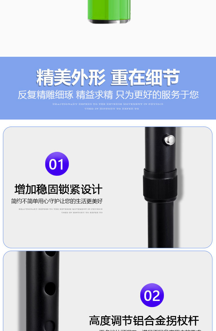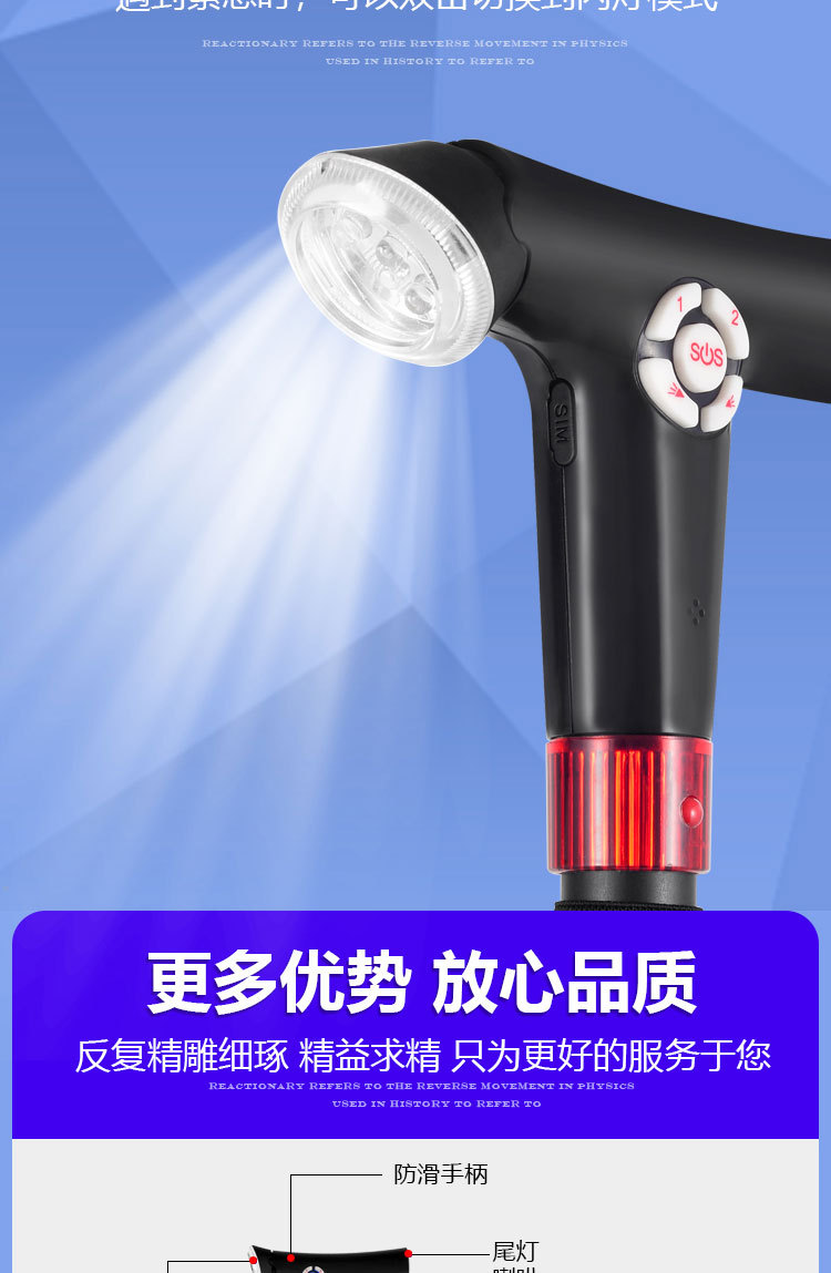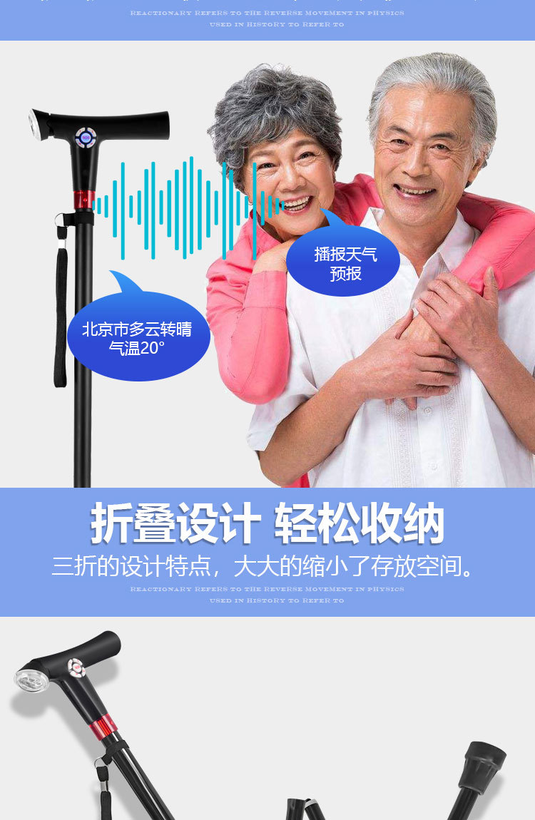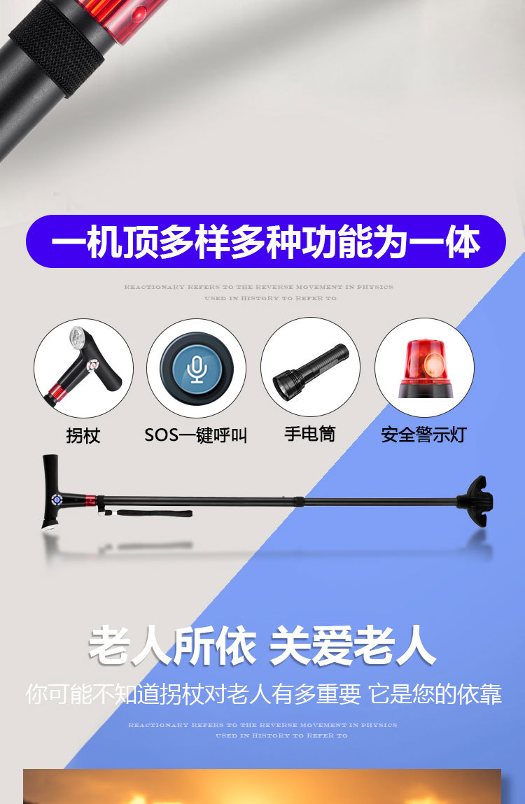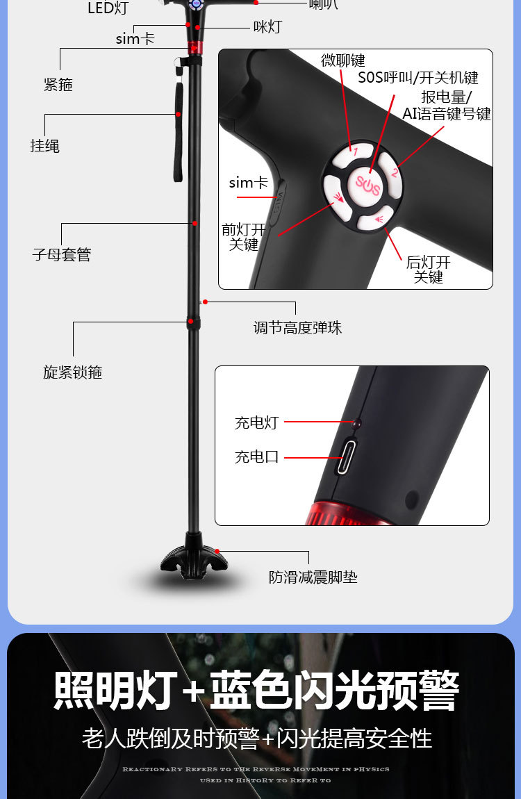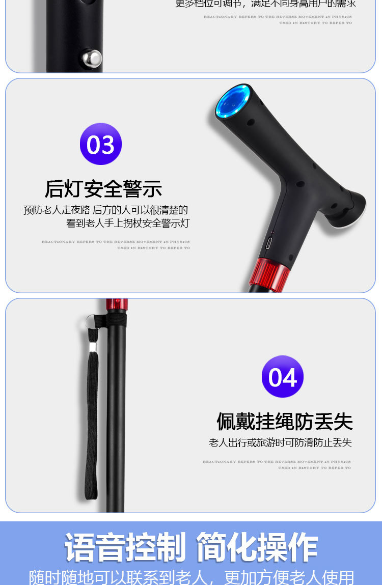 ID 材料 ABS手柄+铝合金管子 镜片 手电筒镜片PVC 按键,挂绳 软硅胶按键,挂绳松紧带 颜色 桃木纹手柄(或黑色)+管子乌黑雾面氧化 尺寸 手柄尺寸 (mm) 29*30*155 大管子尺寸(mm) 外径22 厚度1.1 长度47.5 小管子 (mm) 外径19厚度1.1长度46.5 可调高度/ 重量.克 最高92cm 最低62cm/ 330 蓝牙 版本4.0 支持10米内无障碍物 防水等级 不防水 电池 最大充电电压 5.0V 容量 2600mAH 待机时间 7-12天 通话时间 9-10小时 充电接口 TYPE-C 华为手机充电口 电池电压 3.8V 外形规格 18650 多媒体 蓝牙 连接名称:智能拐杖 版本4.0 范围10米内 收音机 FM调频 频段87-108MHz 支持插内存卡(内置) TF卡最大支持32G 报警(手动+自动) 红光闪烁+报警声音100db 蓝牙通话 不支持(可扩展) 充电接口支持连接电脑更新资料 连接电脑可当外接音箱 照明 灯珠 1瓦单灯珠 连续使用8-9小时 通讯 芯片 8910SS GPRS Class 12 声音 铃声 yes 免提 Yes 喇叭 外径26mm0.5-1W 麦克风 yes 4.0*1.5 抗干扰受话器 其他 按键 Yes(一键SOS 4G版本一键报时 2G不支持) 指示灯 高亮度LED灯 端口 耳机接口 NO 充电接口 TYPE-C 华为手机充电口 SIM卡槽 1 NANO SIM IO 端口 2pin 摄像头 无 防跌倒 跌倒报警 支持(跌倒报警10秒内未停止启动SOS电话) 其他 天线 内置FPC GSM天线 计步器 NO 通讯网络 GSM B2 B3 B5 B8 TDD-LTE B1 B3 B5 B8 FDD-LTE B38 B39 B40 B41 GPS GPS芯片 支持 WIFI WIFI定位 支持 App端(IOS+安卓) 双向通话 支持双向通话,并且屏蔽其它骚扰电话 微聊 无 远程监听 支持回拨模式远程监听(通过高抗噪麦克风可清晰的远程听到对方的环境声音) 搜星频率设定 可设定1分钟、10分钟、30分钟、及卫星关闭手动搜星,用户可以根据自己需求自主掌控 电子围栏 可设定多个电子围栏 心律血压测试 无 消息提醒 可提醒进出电子围栏状态、电池电量低或充满状态 多个拐杖添加 可在1个app中添加多个拐杖 历史轨迹查询 可查询1个月时间范围内的历史轨迹 历史轨迹播放功能 可自动播放轨迹 WIFI定位+GPS定位+基站辅助定位 wifi定位精度3-50米,GPS定位精确度可达到3~10米、LBS精确度可达到100~500米范围 电池电量监控 可随时知道拐杖电池电量 网络自动为腕表校时 绑定后腕表自动与网络时间同步