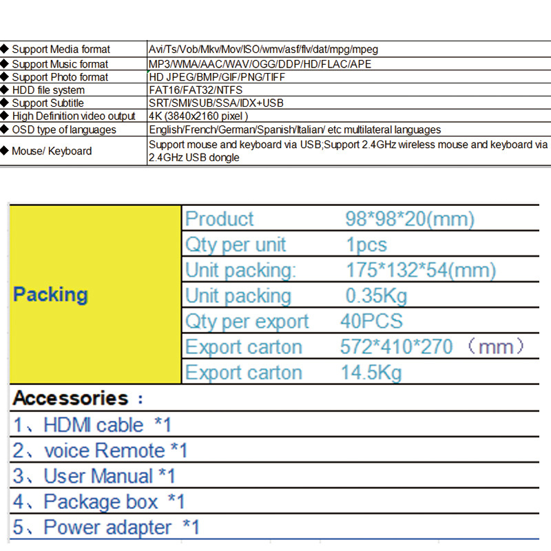 Список упаковки Set-top box, remote control, hdml cable, manual, dc power supply, color box