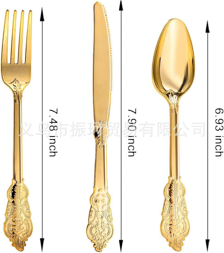Фабричная цена, прямая продажа, ретро тисненые золотые одноразовые пластиковые столовые приборы, вилки и ложки, столовая посуда для вечеринки и свадьбы