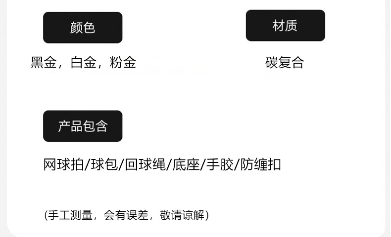![]() | Pink gold + black gold: free training set - tennis ball with string*2, anti-slip base*1, keel hand glue*2, anti-tangle buckle*1, tennis bag*1+shock absorber 2 | ¥158.0 / ≈ 1 909 ₽ | 658203 | 5795902737350 | |