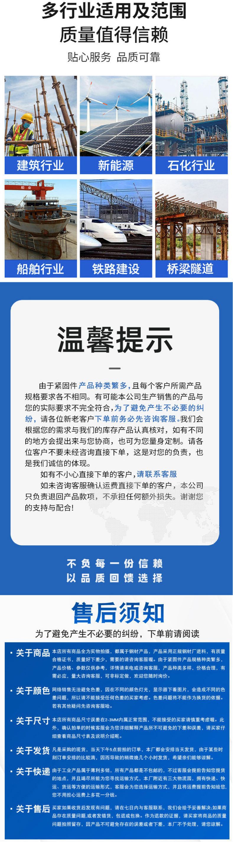 1. 规格定制:螺纹直径可从M16 - M48,长度从[X]mm - [X]mm按需定制。展示不同定制规格螺栓应用在不同电力设施(如变电站架构、输电线路铁塔)的场景图,满足各类电力工程的特殊需求。