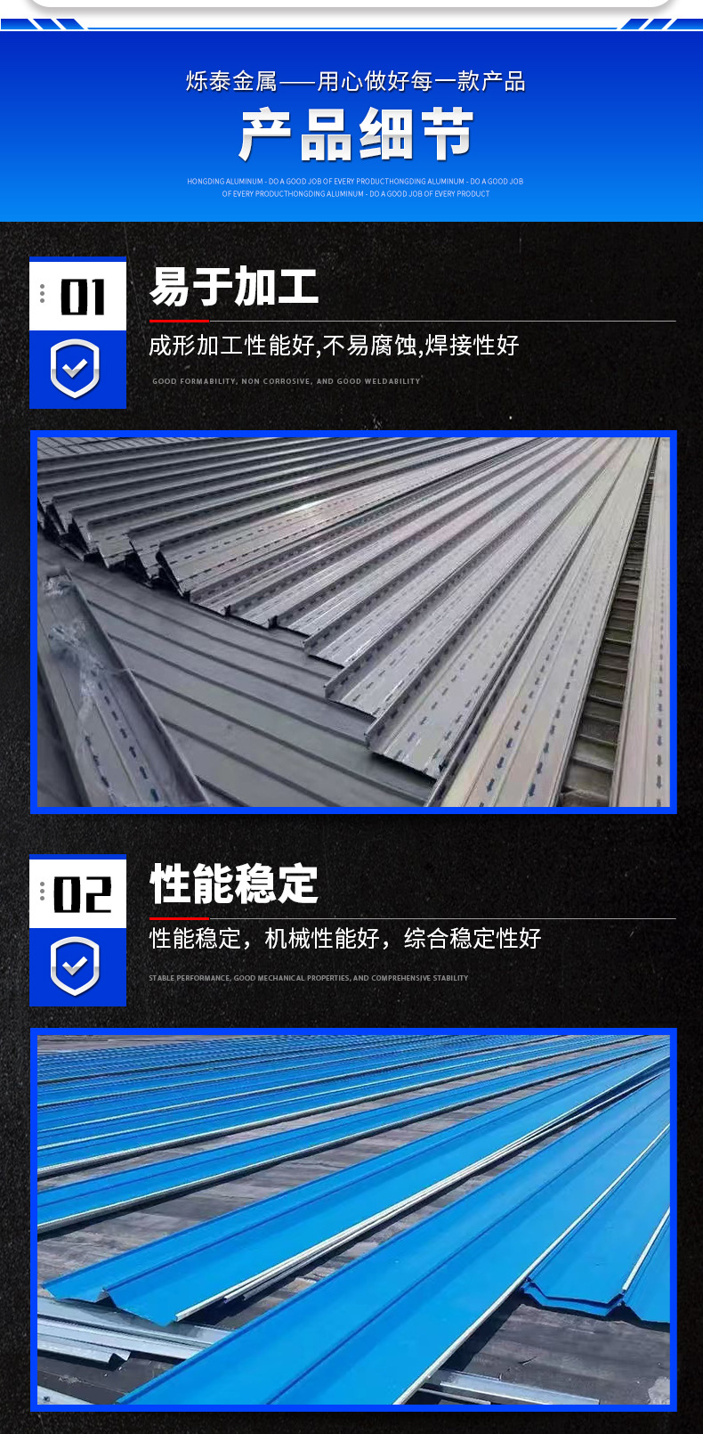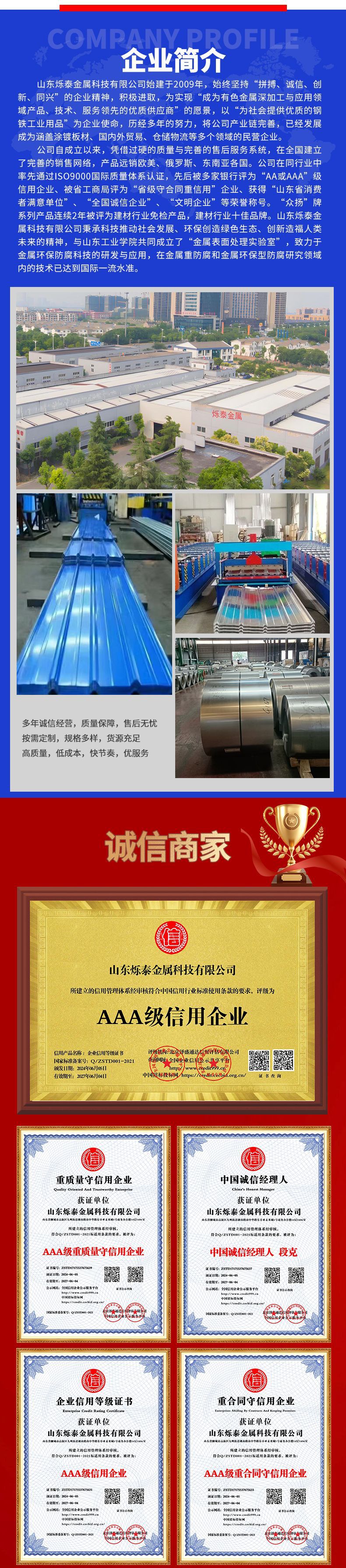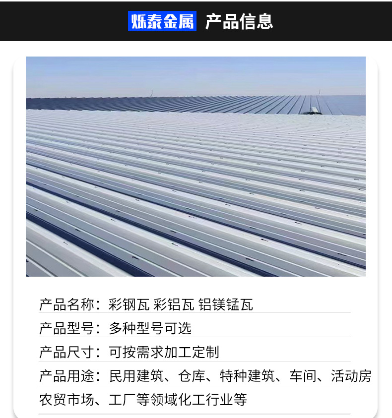 打孔彩钢瓦彩铝瓦铝镁锰仿古瓦楞板 山东烁泰金属科技有限公司是一家铝和铝合金加工生产销售于一体的综合性企业。主要产品有铝卷、铝板、铝合金板、花纹铝板、彩涂铝卷、压型铝瓦等产品。优秀的技术团队加上先进的生产设备为提供更优质的铝材,获得多家国企单位,公司的认可。产品广泛用于 : 保温工程、机械加工、建筑制造、化工、包装、防腐等行业。 主生产经销批发的花纹铝板、彩涂铝卷、铝板、铝卷、铝瓦楞板仿古铝瓦用于工程建设。畅销消费者市场,在消费者当中享有较高的地位,公司与多家零售商和代理商建立了长期稳定的合作关系。