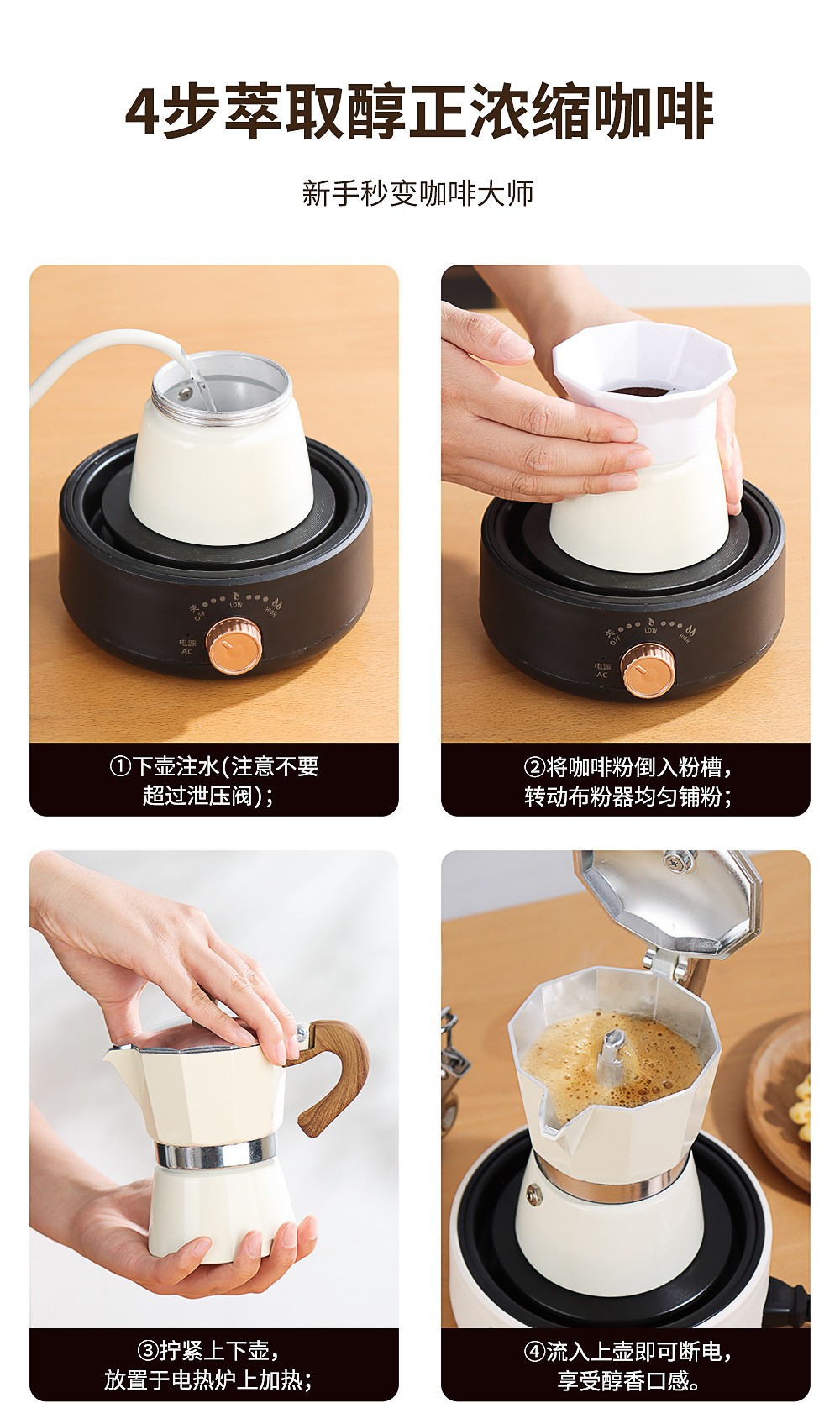 ![]() | 150ml | White [moka pot + electric stove + grinder + powder spreader + filter paper] | ¥96.5 / ≈ 1 164 ₽ | 10000 | 5810321032067 | |