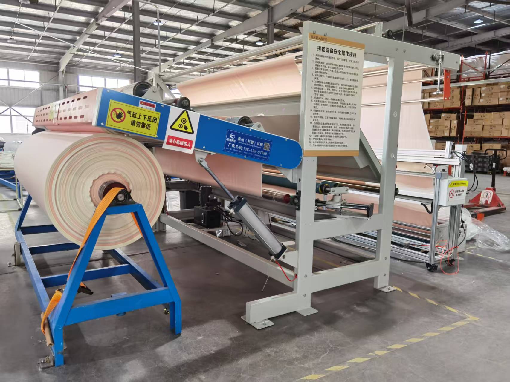 材料介绍,该机型整机采用,5个厚钢板冲压成型,韧性强振动力小,高速打卷过程中,更稳,压闭滚筒采用硅胶滚筒,更耐磨,铝合金防皱棍拨边去皱,气压大小可,根据材料调节控制,布料松紧调节控制