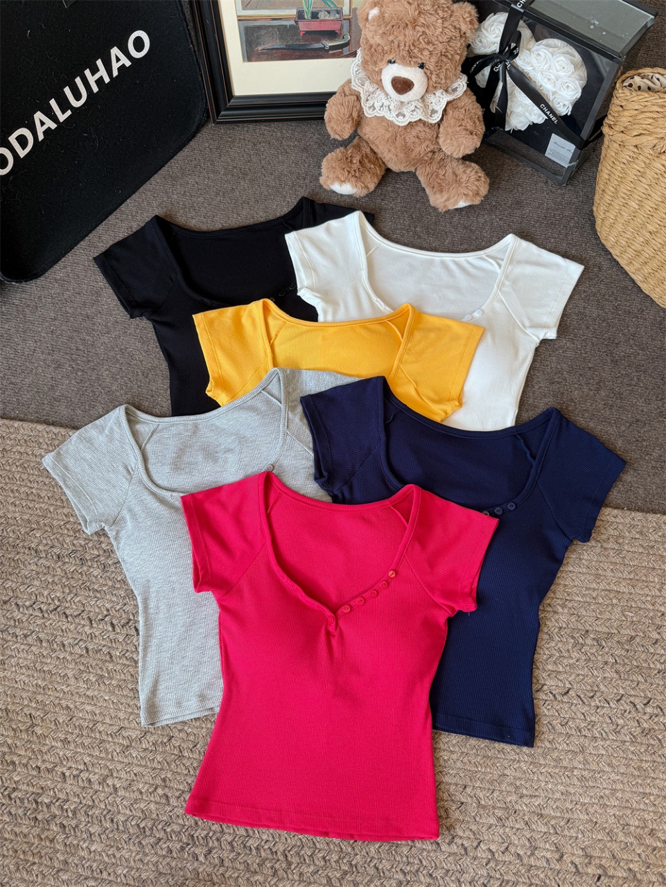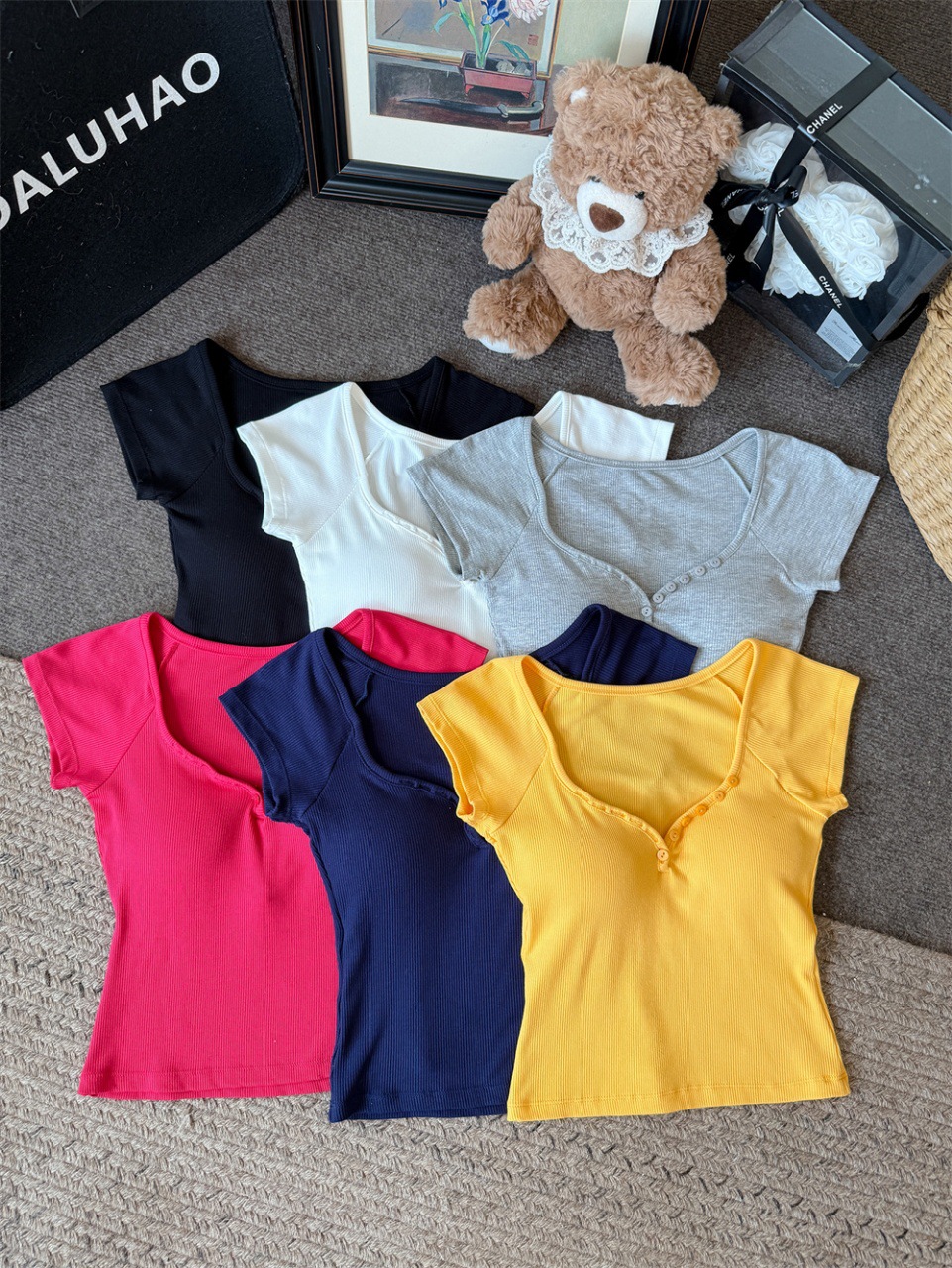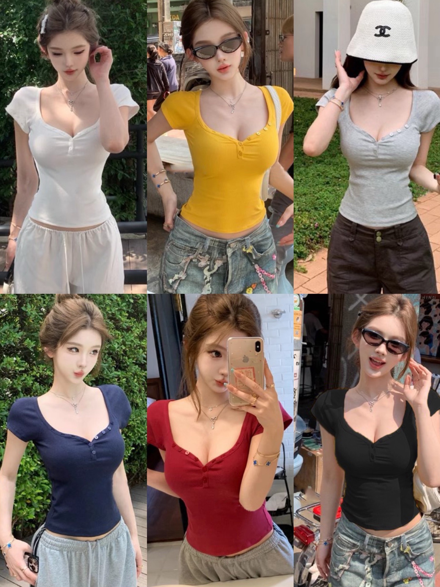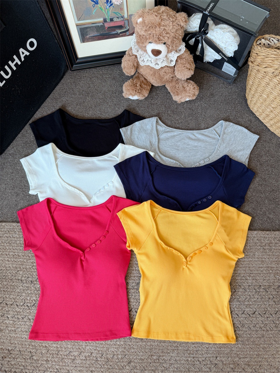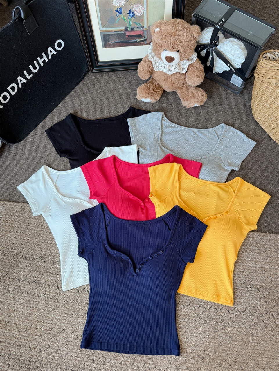5107 # Sexy Peach Heart воротник, облегающая футболка с коротким рукавом для женщин, летняя, V-образный вырез, кнопки, однотонный, повседневный, универсальный топ