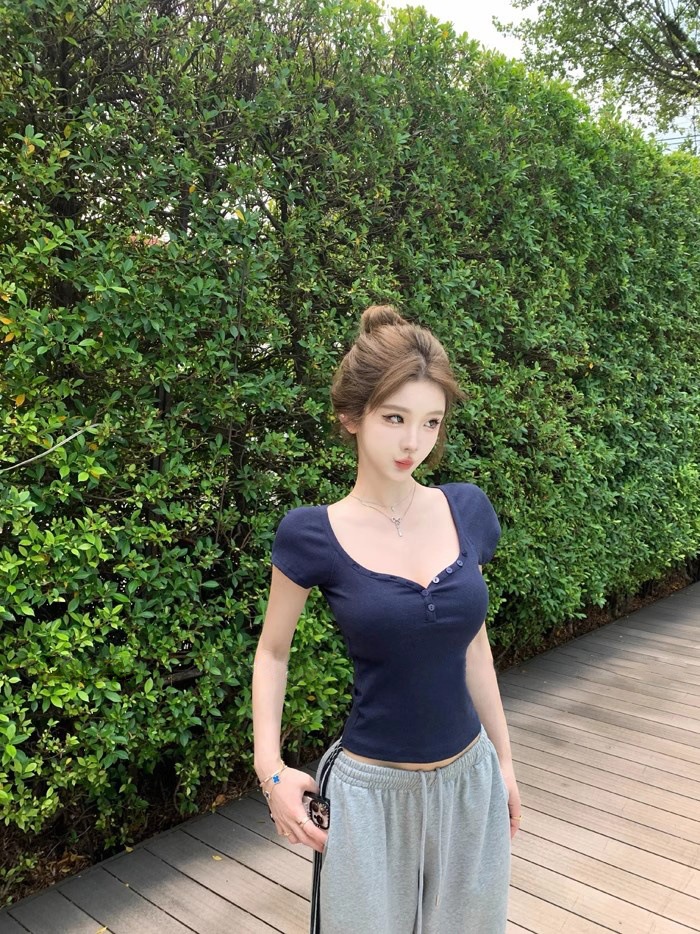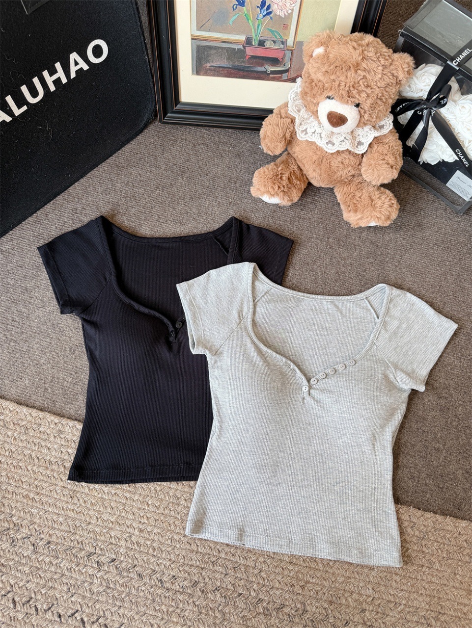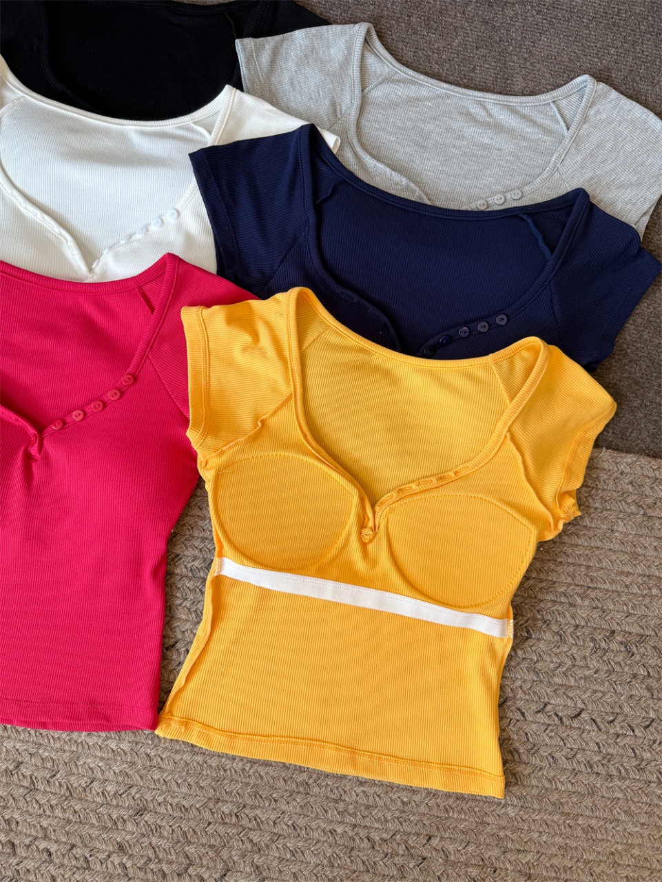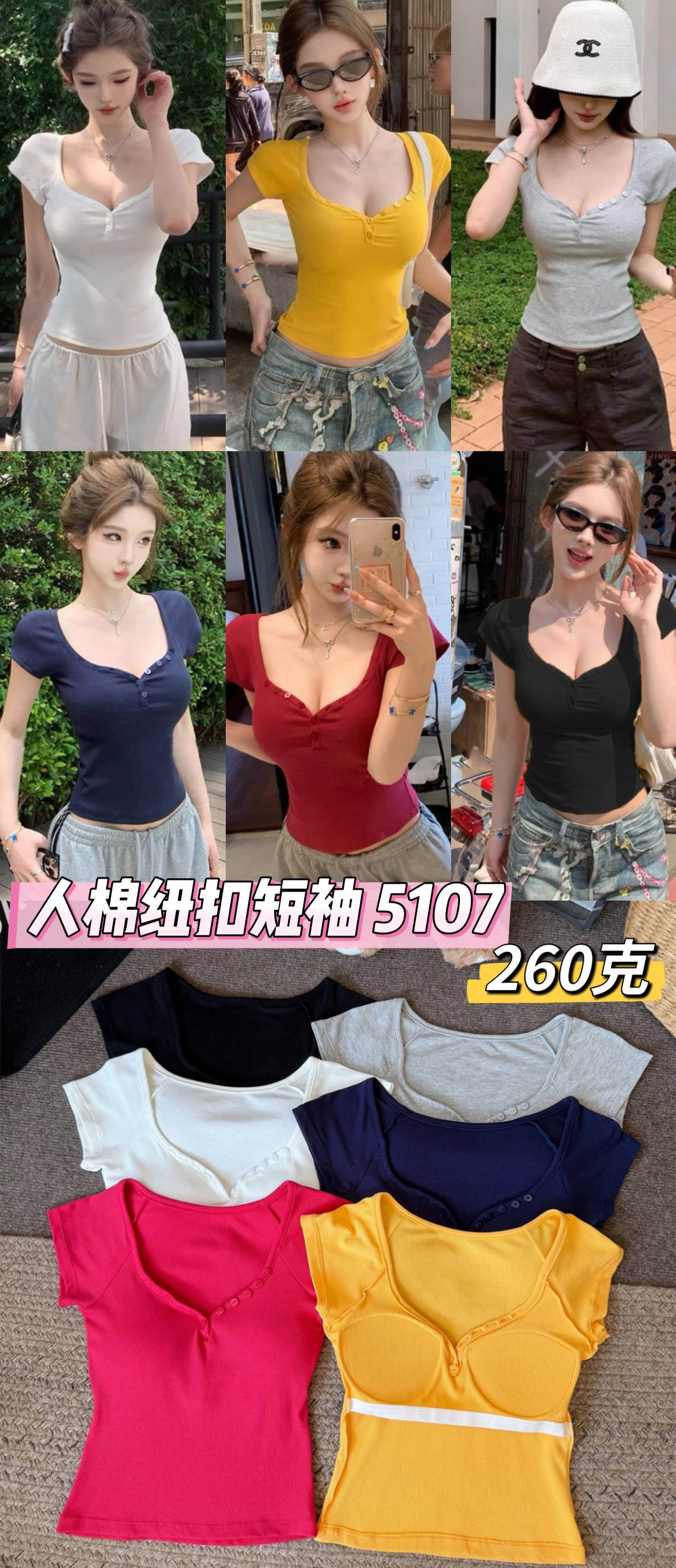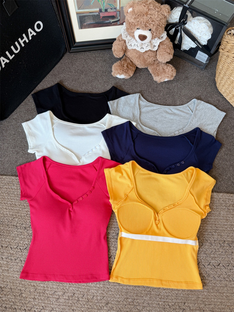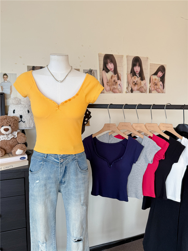 5107 # Sexy Peach Heart воротник, облегающая футболка с коротким рукавом для женщин, летняя, V-образный вырез, кнопки, однотонный, повседневный, универсальный топ