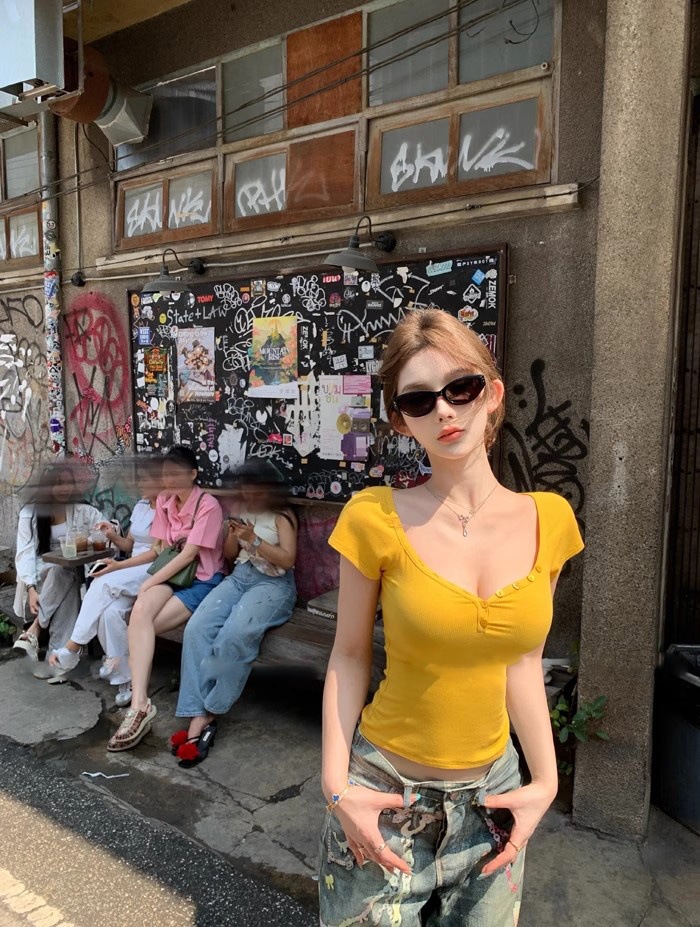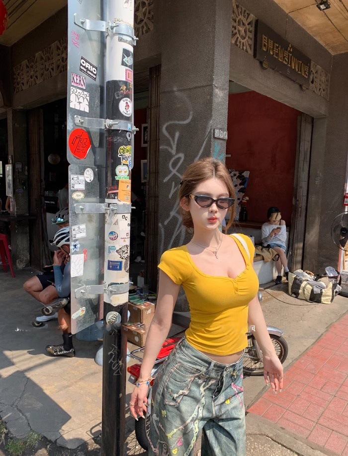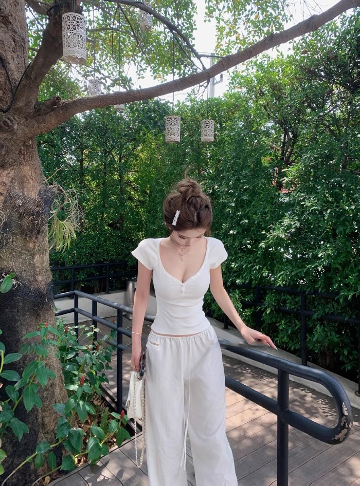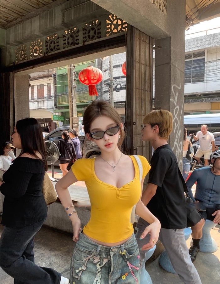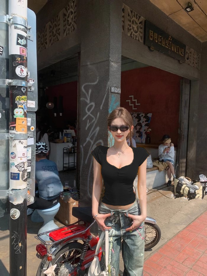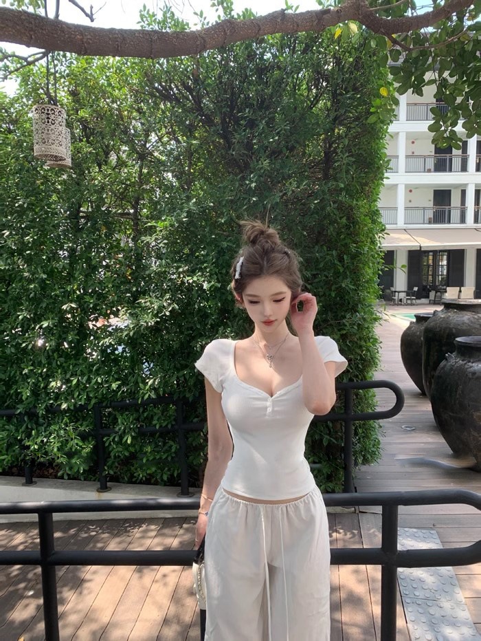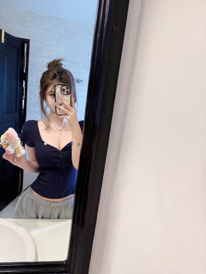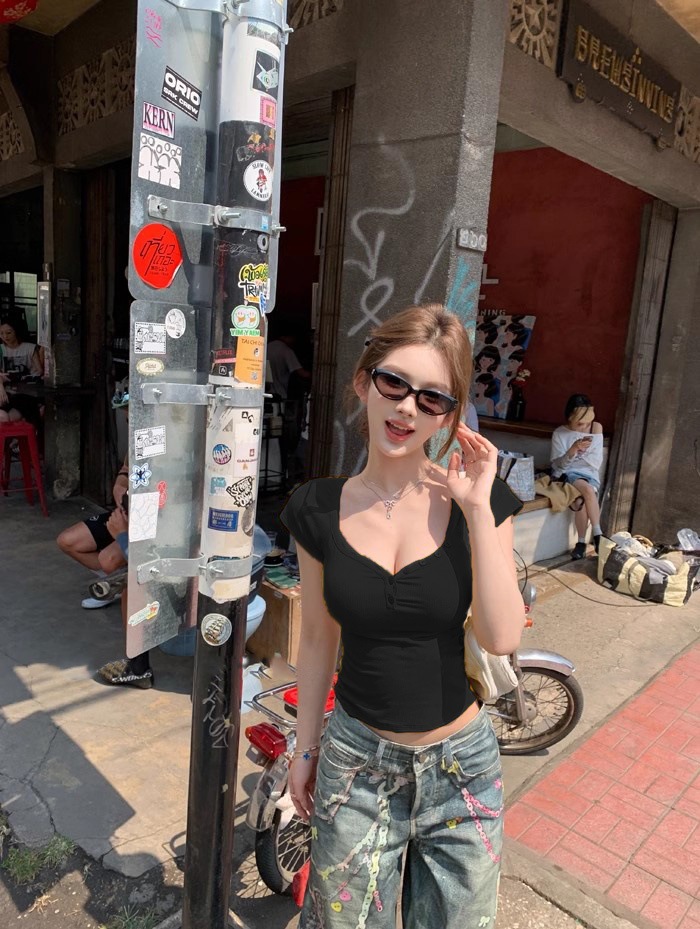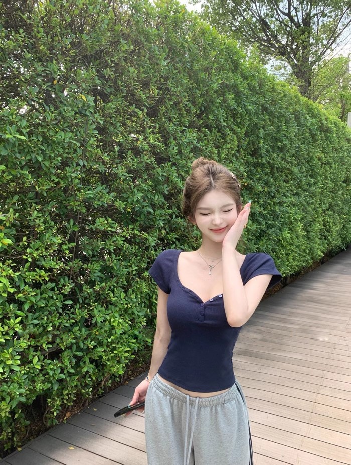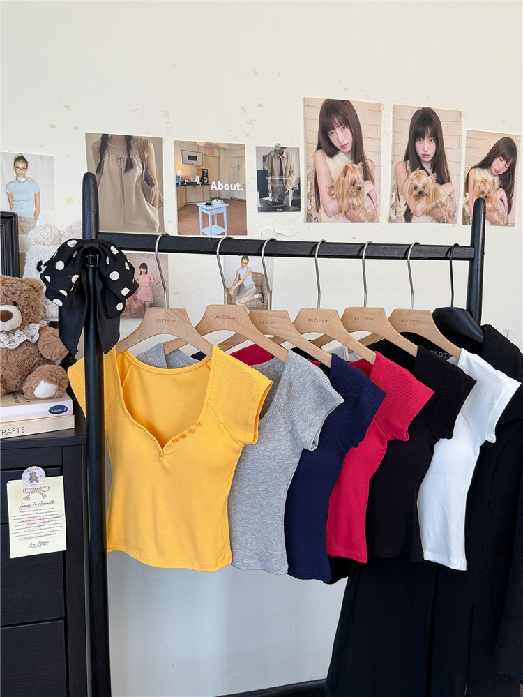 5107 # Sexy Peach Heart воротник, облегающая футболка с коротким рукавом для женщин, летняя, V-образный вырез, кнопки, однотонный, повседневный, универсальный топ