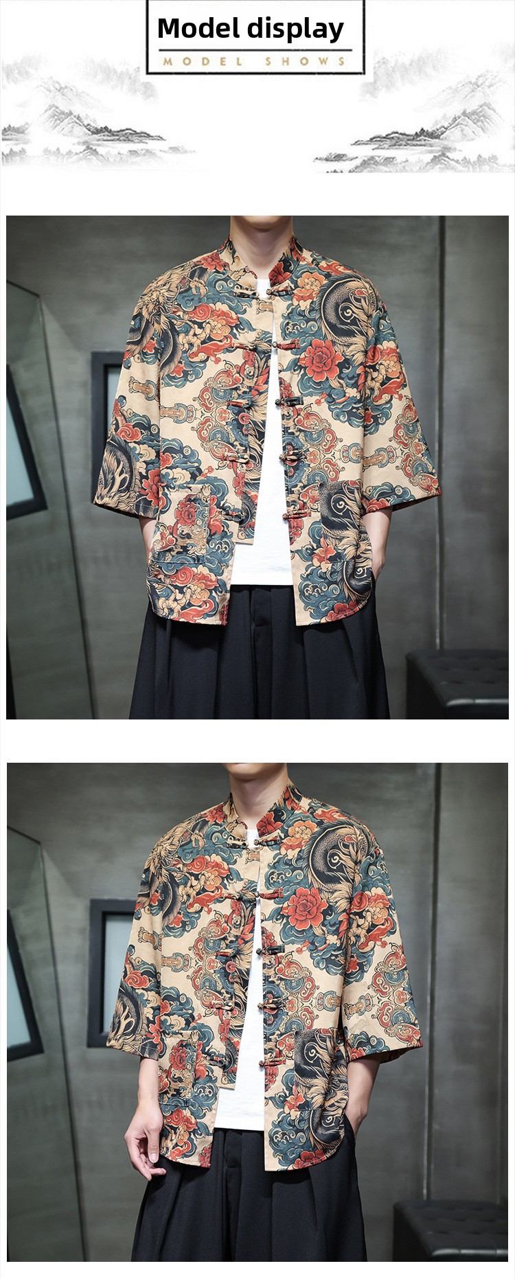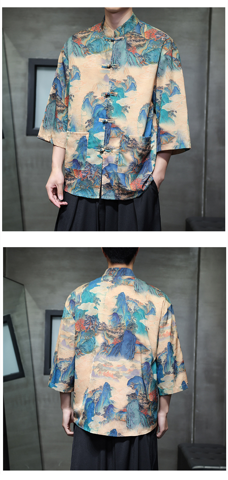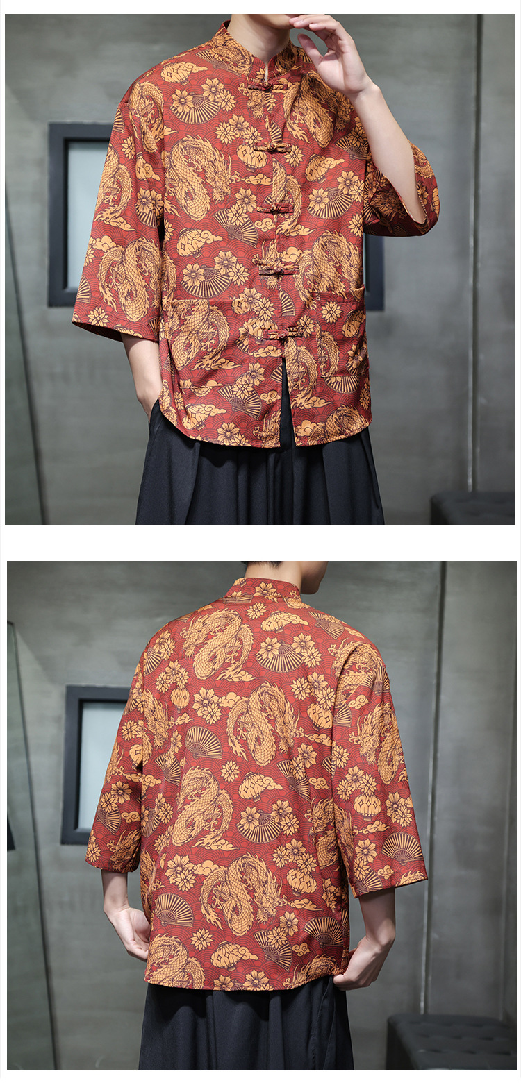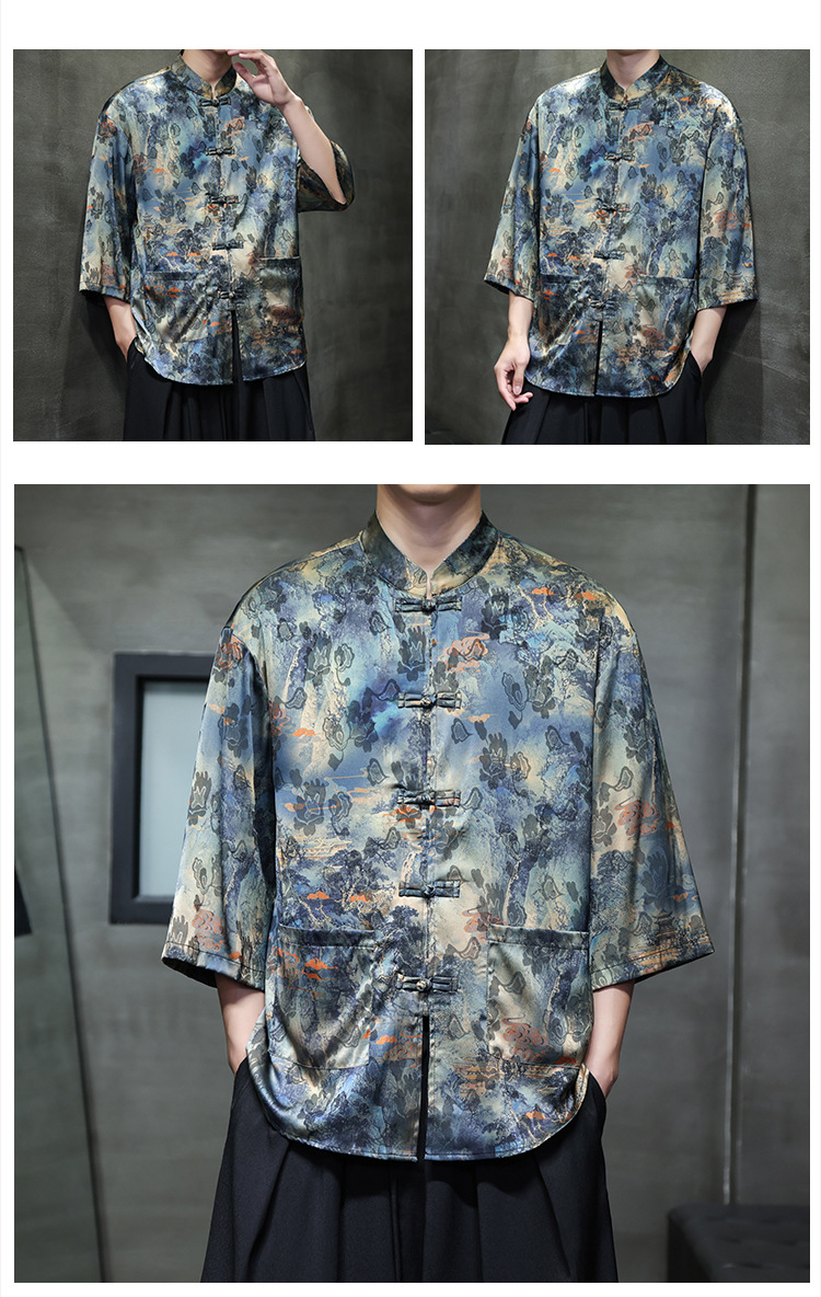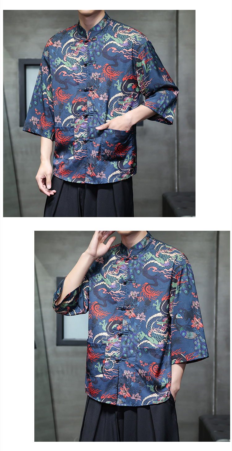 Рубашка с тремя четвертями в китайском стиле для мужчин, танг с застежкой на пуговицу, ханфу, рубашка с коротким рукавом большого размера с принтом, этнический стиль