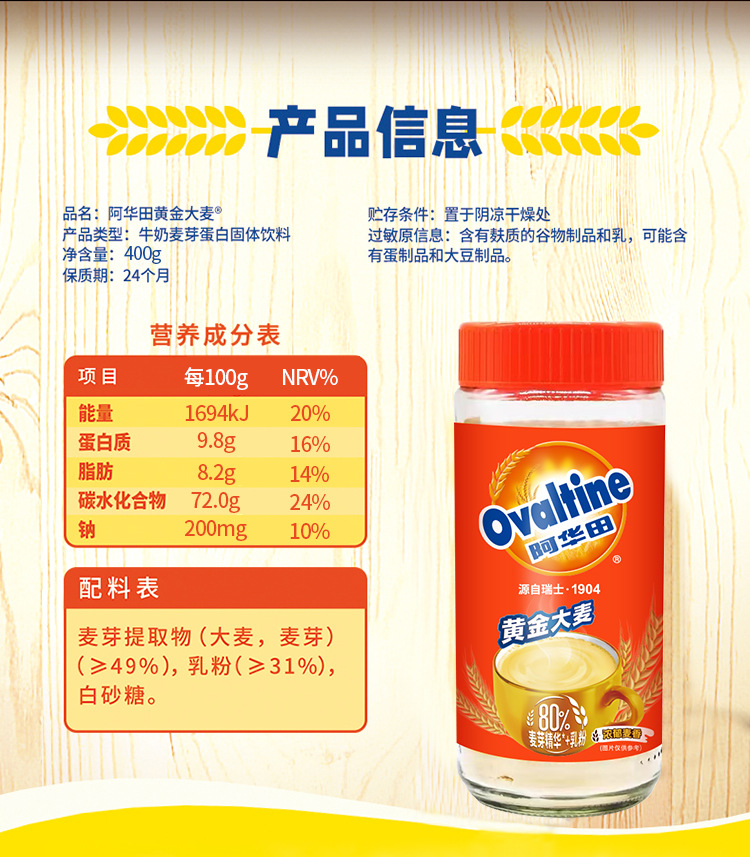 Ovaltine золотой ячменный порошок 400г молочный солодовый протеин, мгновенный напиток, солодовый молочный порошок, питательный завтрак для студентов