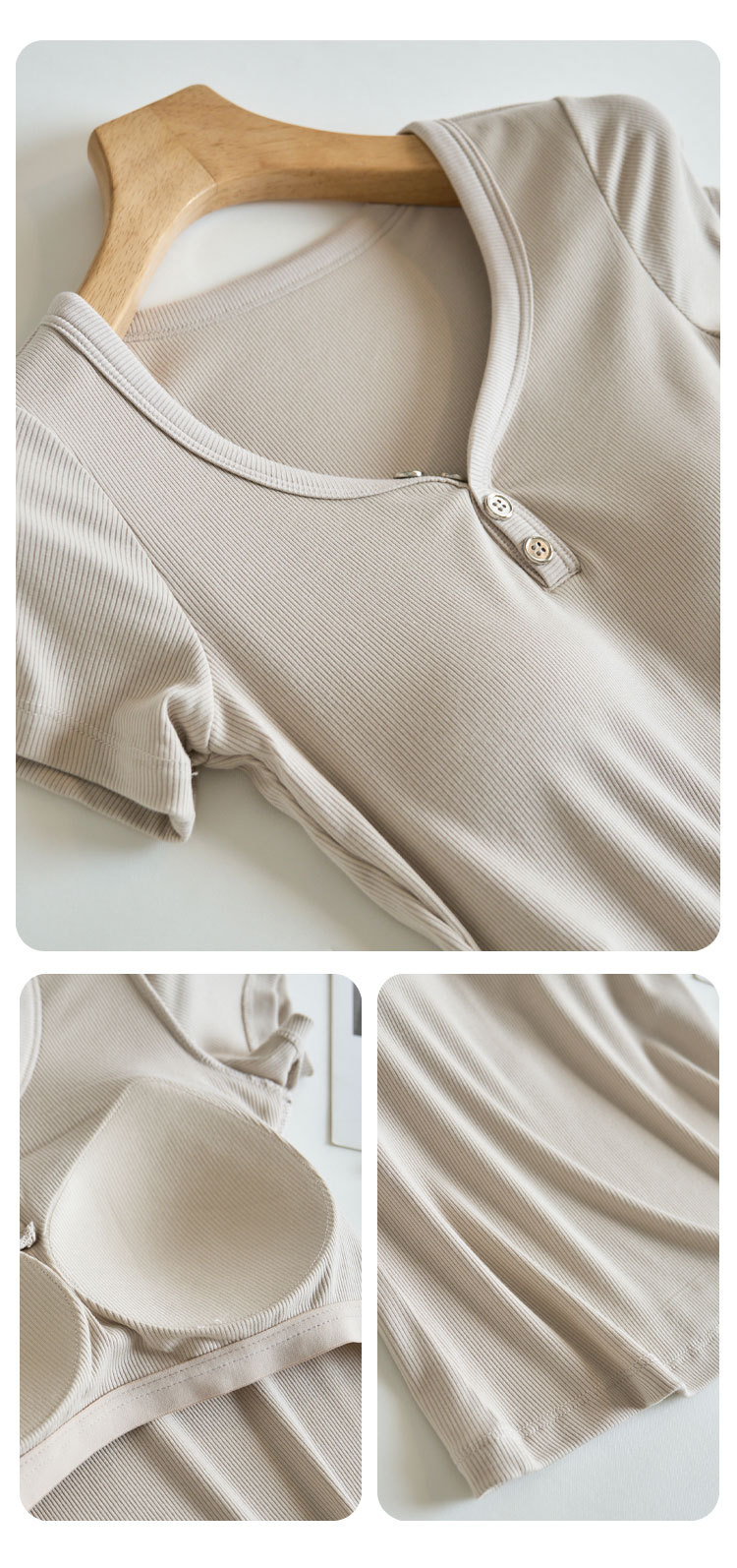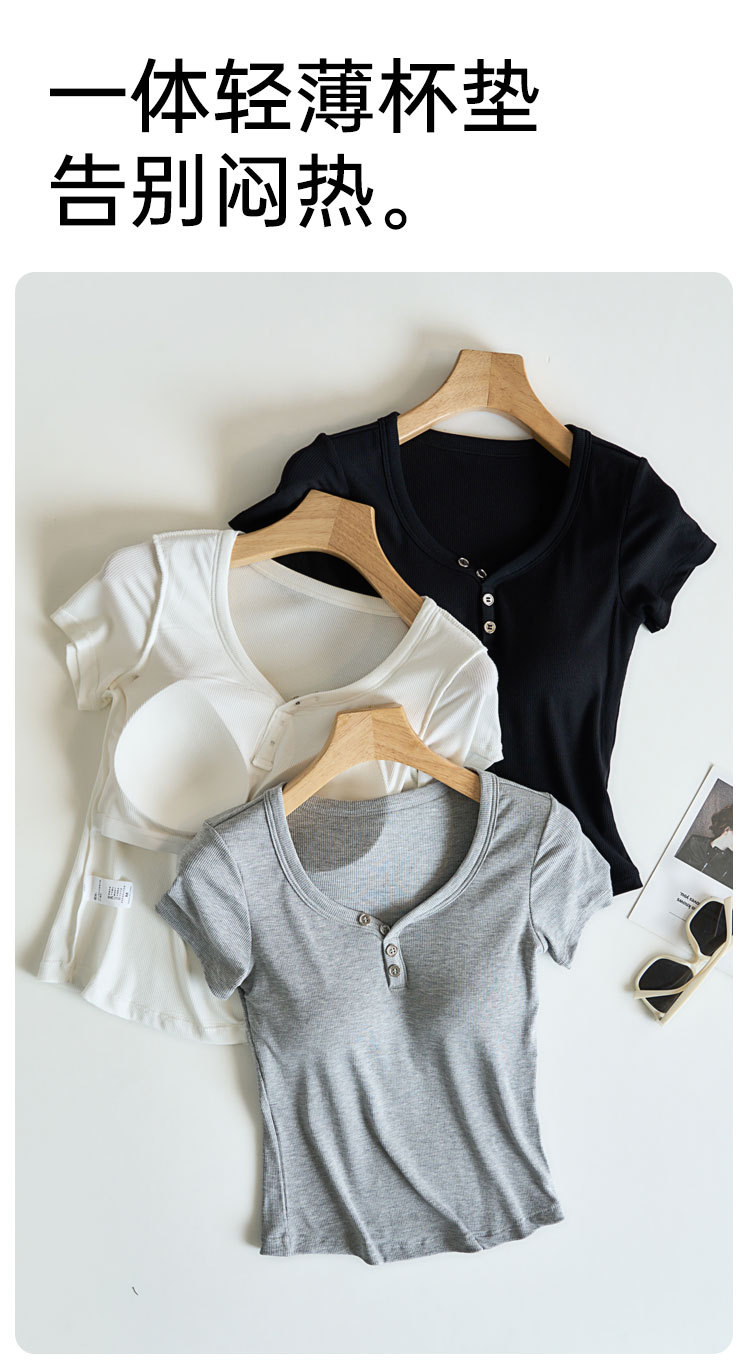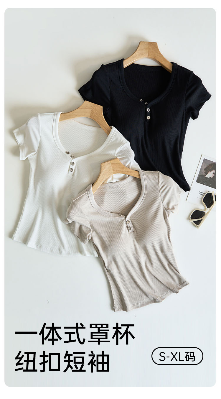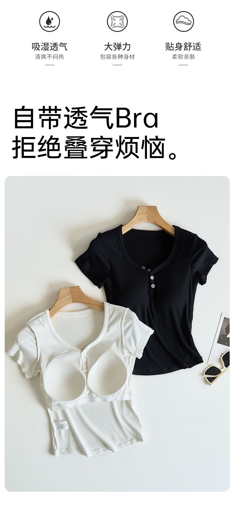 Женская летняя тонкая облегающая трикотажная блузка с половинным рукавом и вставками для груди, интегрированная базовая футболка без бюстгальтера