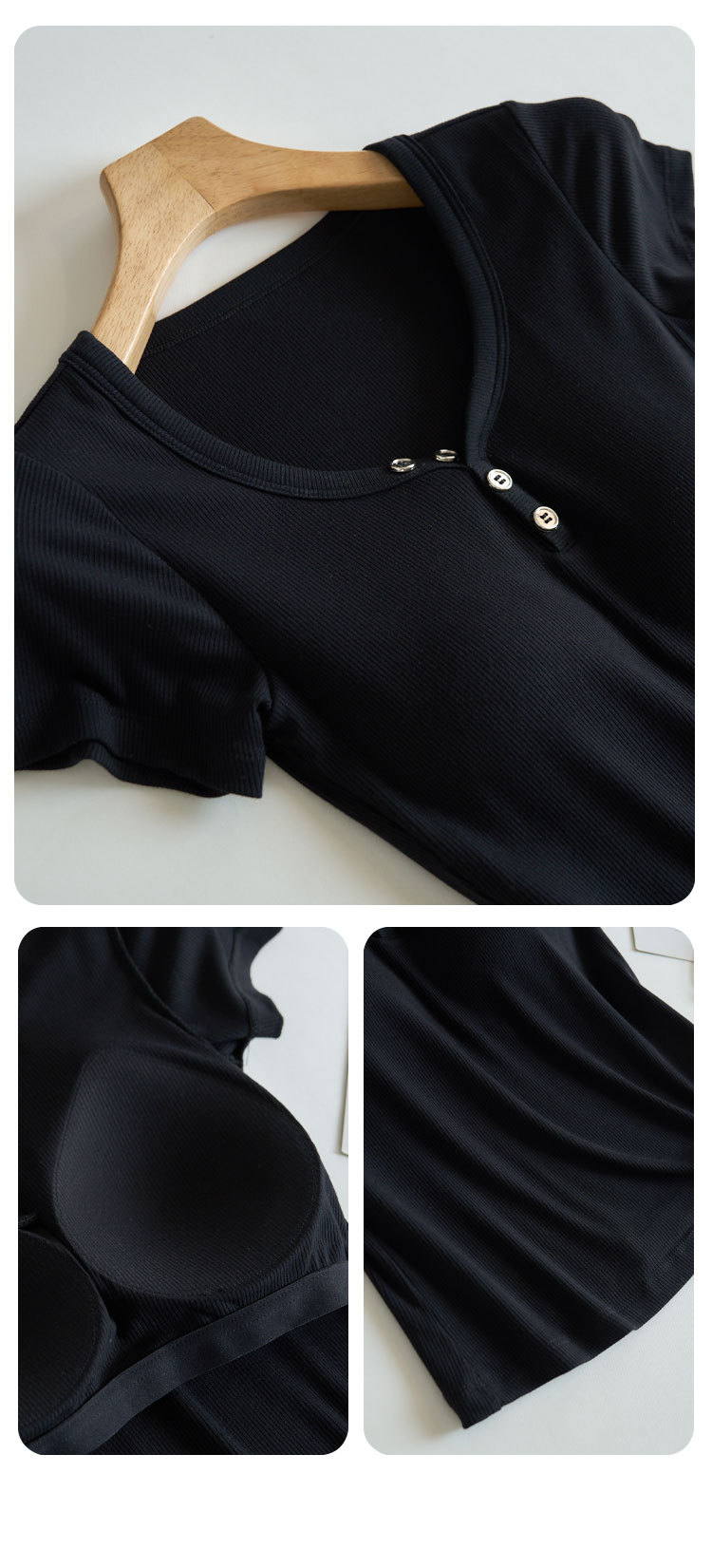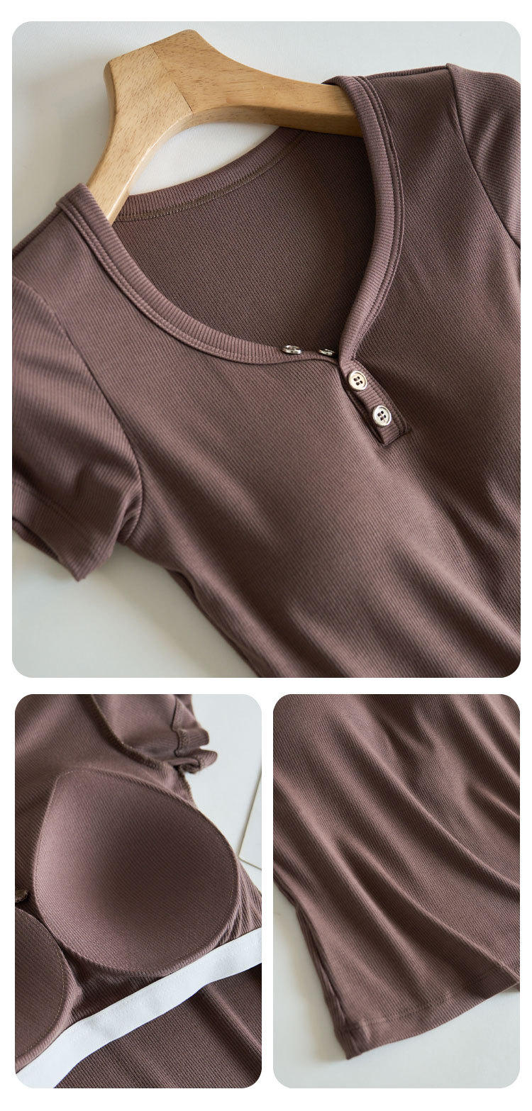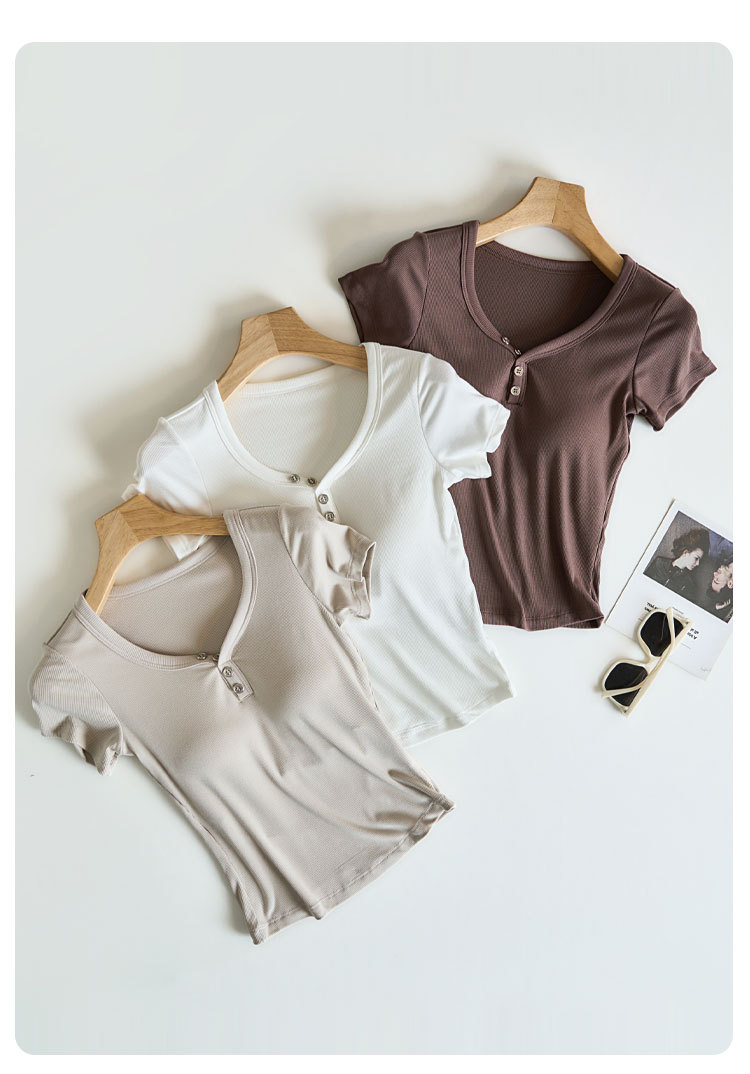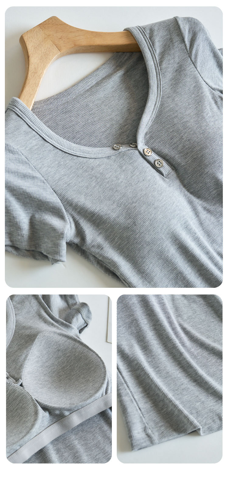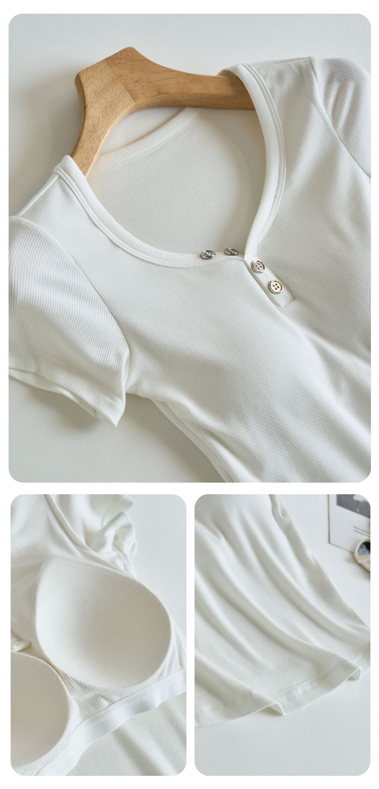 Женская летняя тонкая облегающая трикотажная блузка с половинным рукавом и вставками для груди, интегрированная базовая футболка без бюстгальтера