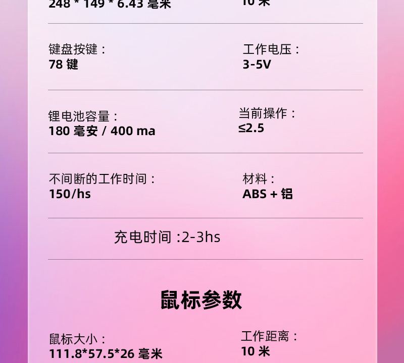 ![]() | Pink - keyboard + rechargeable dual-mode mouse (comes with data cable) | ¥22.0 / ≈ 261 ₽ | 53434 | 6010378503106 | |