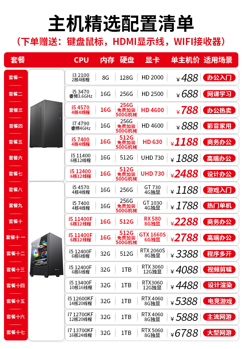 ![]() | Host + 27inch monitors come with keyboard, mouse + wifi receiver) | Package 17: i7-13700kf/32g/1tb gtx5060 8g independent graphics | ¥7288.0 / ≈ 87 901 ₽ | 300 | 5836392605565 |