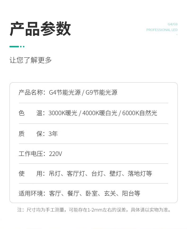![]() | Three color dimming | G9- 7w >97ra full spectrum | ¥3.8 / ≈ 46 ₽ | 8945678 | 6115563883664 | |