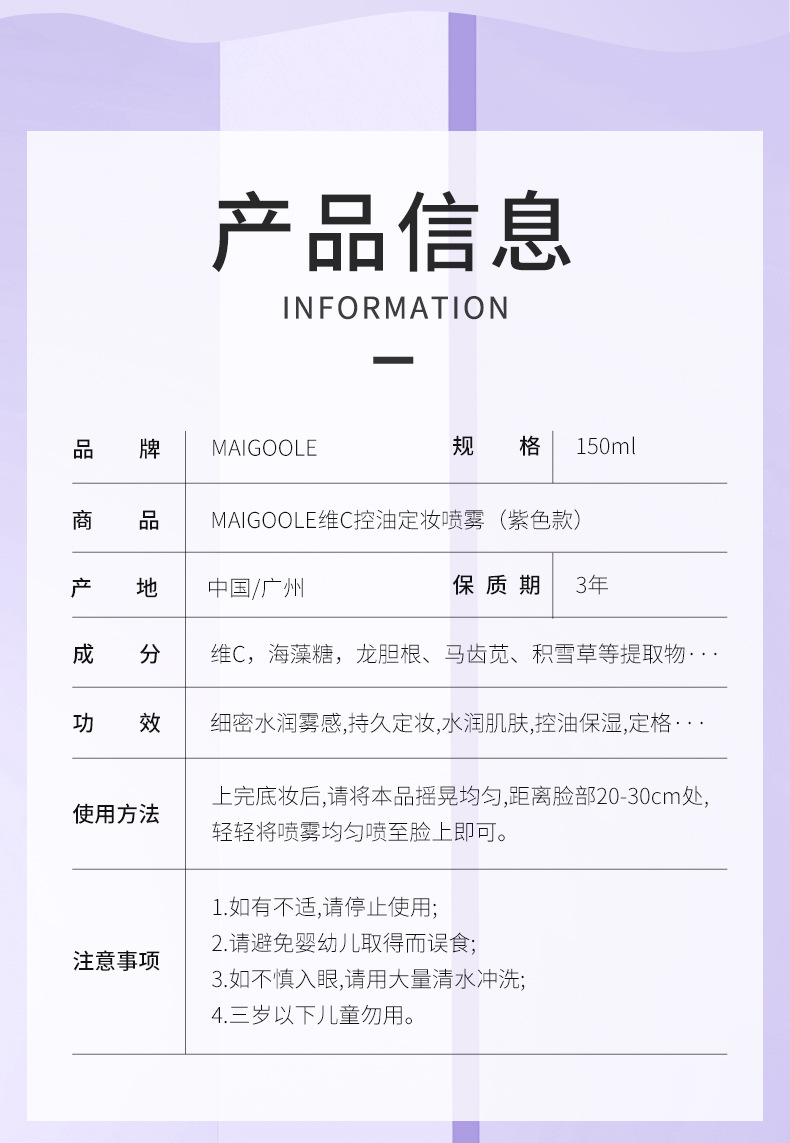 ![]() | Maigoole vitamin c oil control makeup setting spray (purple) | 150ml | ¥3.8 / ≈ 46 ₽ | 95283 | 5840966733542 | |