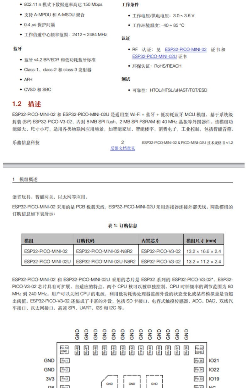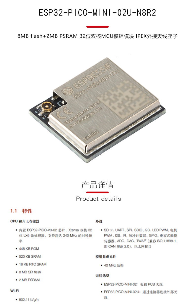 Esp32-Pico-Mini-02U-N8R2 Wi-Fi+Bluetooth 8Mb 32-битный двухъядерный МК модуль с одним местом
