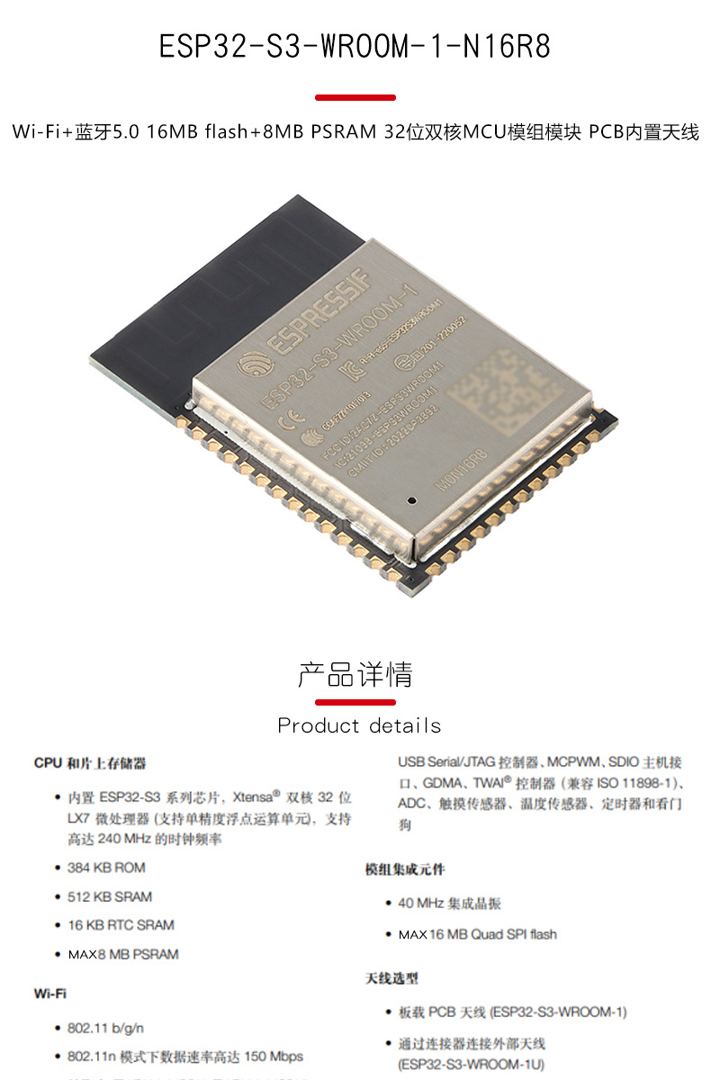Esp32-S3-Wroom-1-N16R8 Wi-Fi+Bluetooth 16Mb 32-битный двухъядерный МК модуль