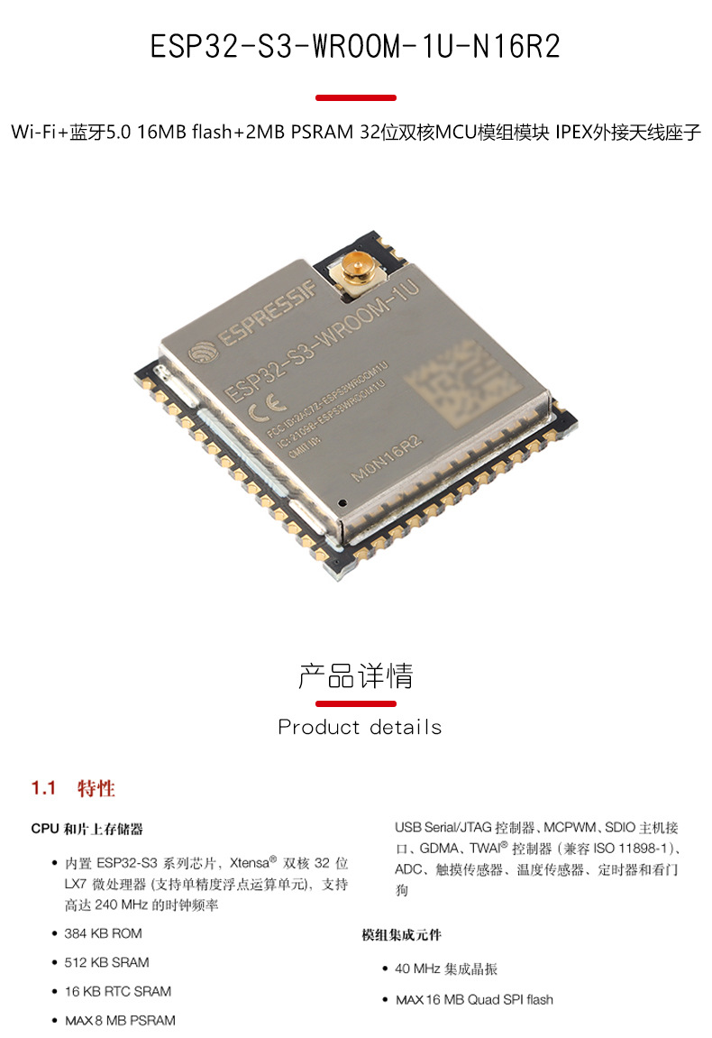 Esp32-S3-Wroom-1U-N16R2 Wi-Fi+Bluetooth 16Mb 32-битный двухъядерный МК модуль в наличии