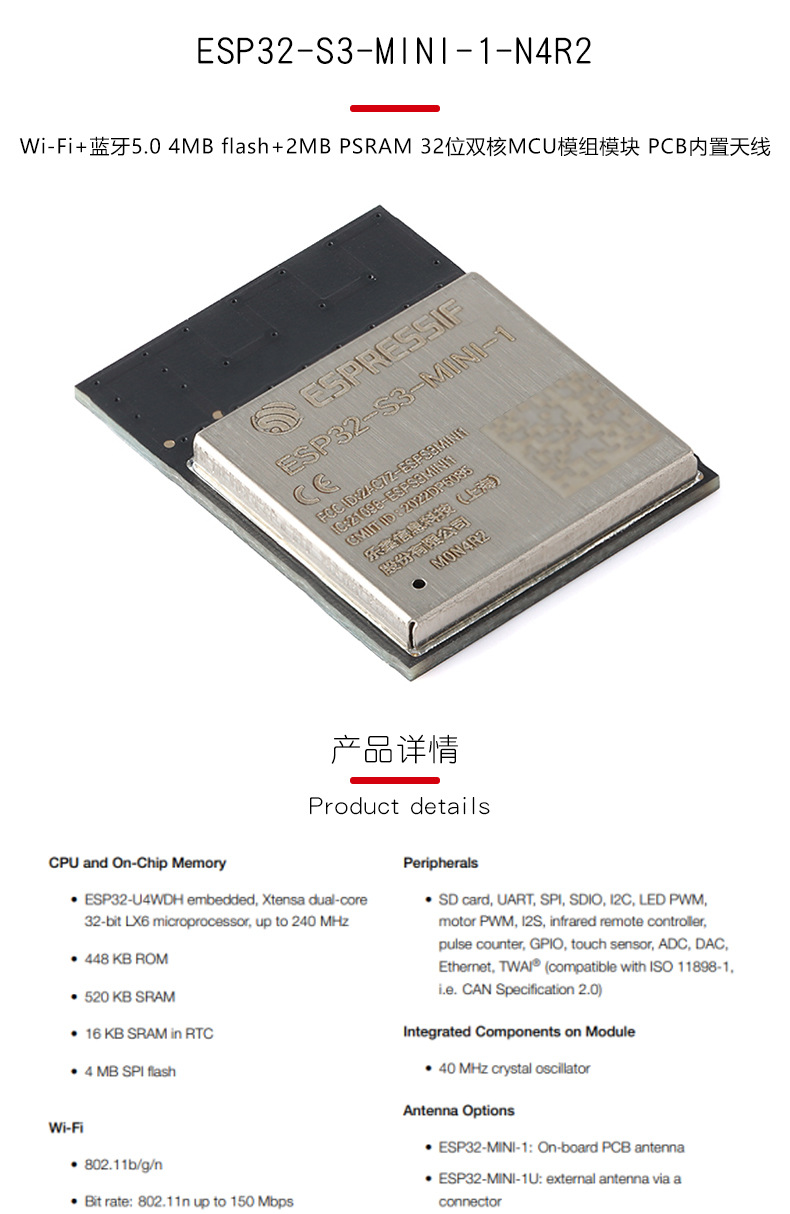 Esp32-S3-Mini-1-N4R2 Wi-Fi+Bluetooth5.0 4Mb 32-битный двухъядерный МК модуль в наличии