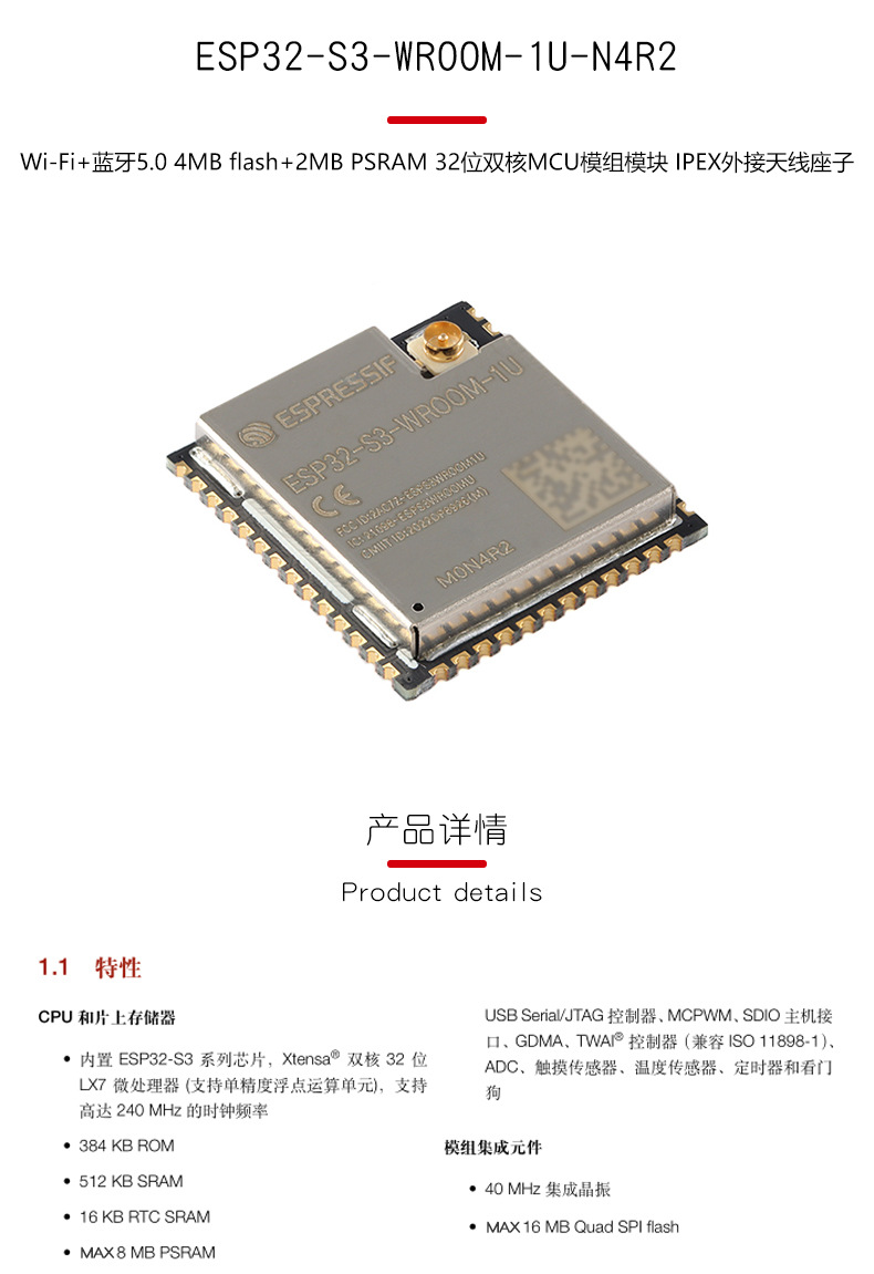 Esp32-S3-Wroom-1U-N4R2 Wi-Fi+Bluetooth 4Mb 32-битный двухъядерный МК модуль с одним местом