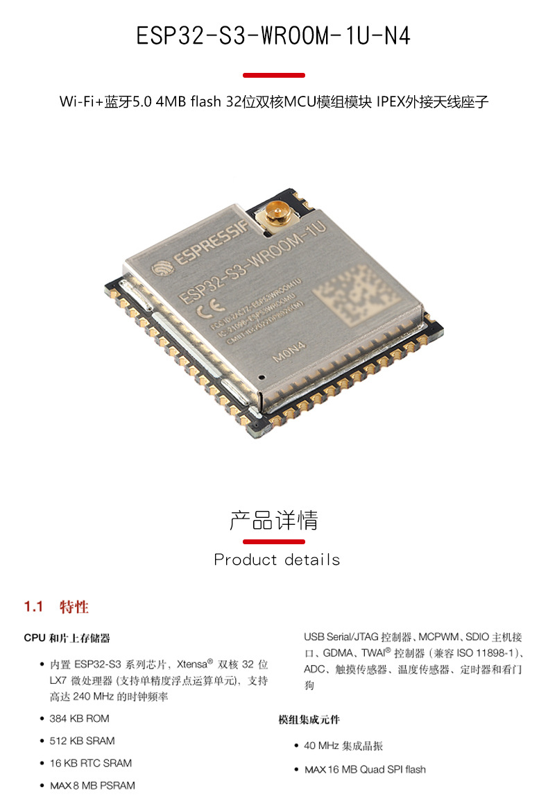 Esp32-S3-Wroom-1U-N4 Wi-Fi+Bluetooth 4Mb 32-битный двухъядерный МК модуль с одним местом