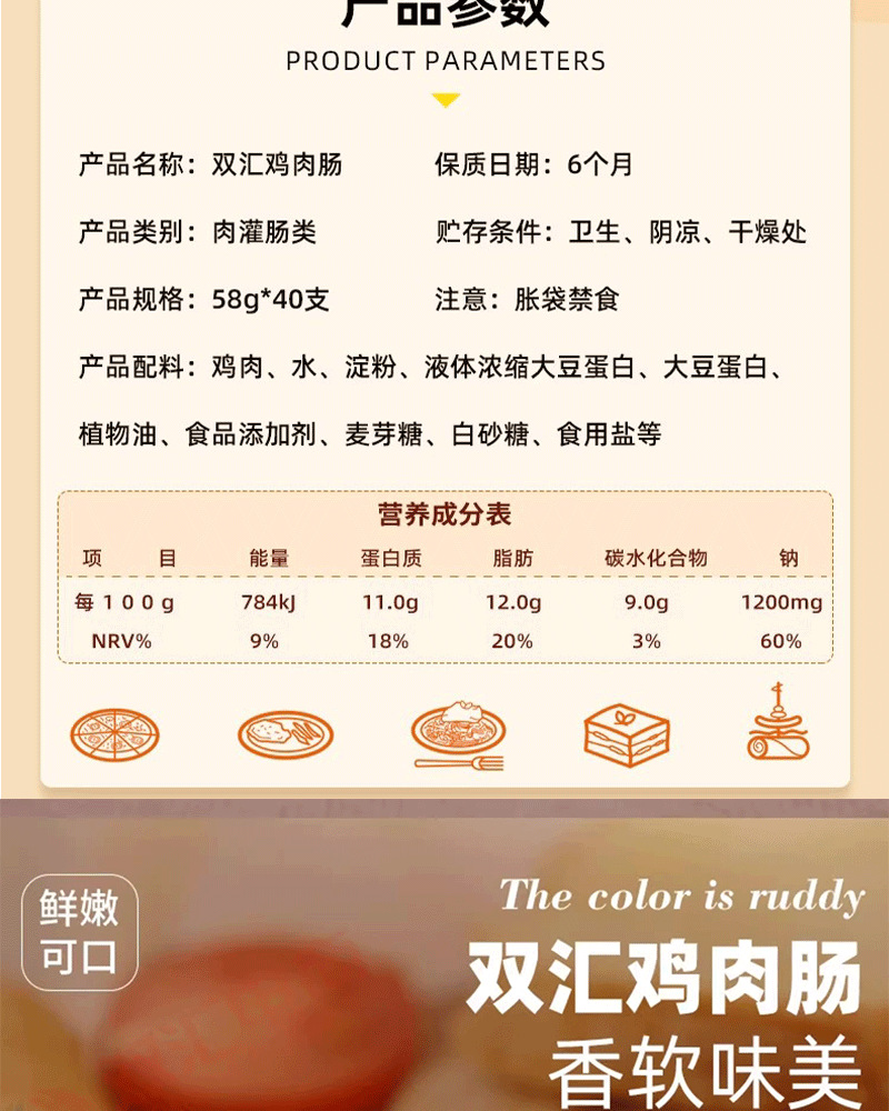 ![]() | Shuanghui chicken sausage 58g | ¥0.95 / ≈ 11 ₽ | 9749 | 5907769153247 | |