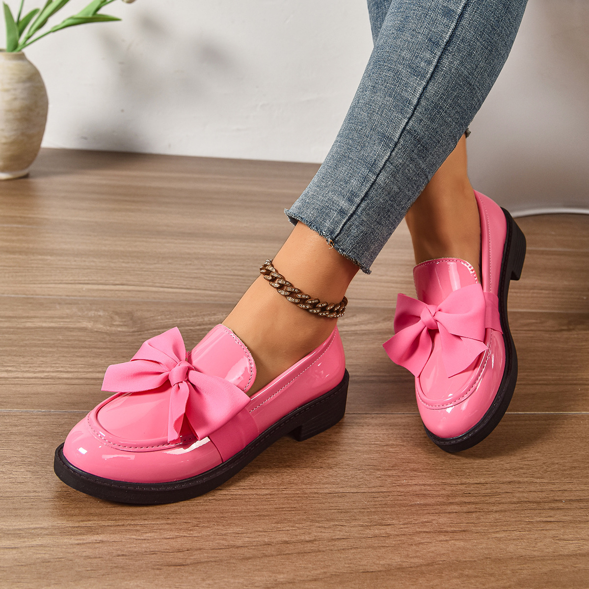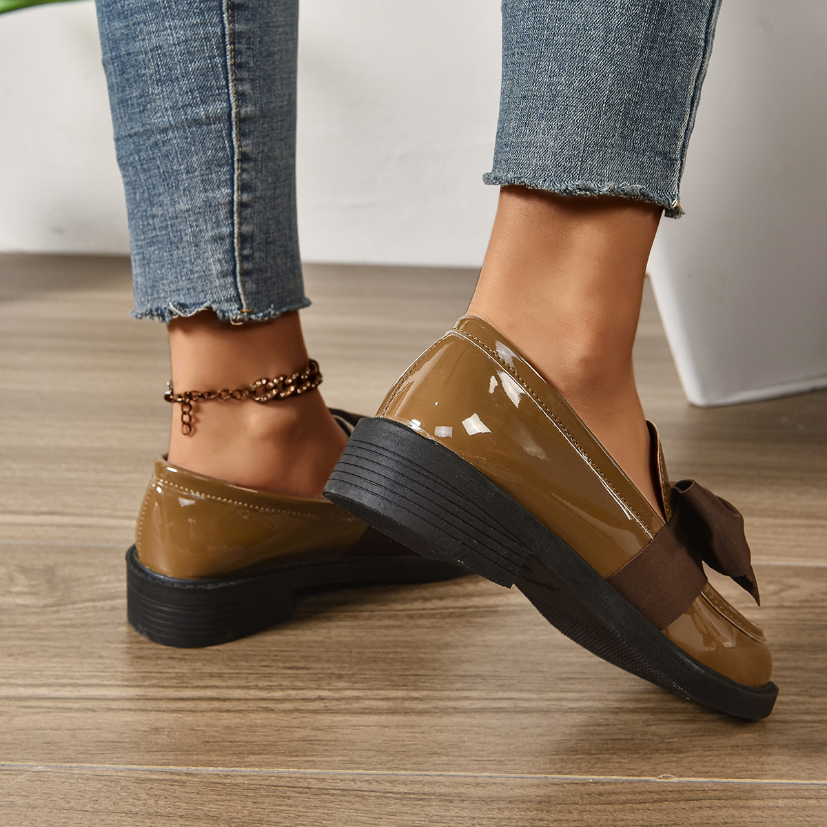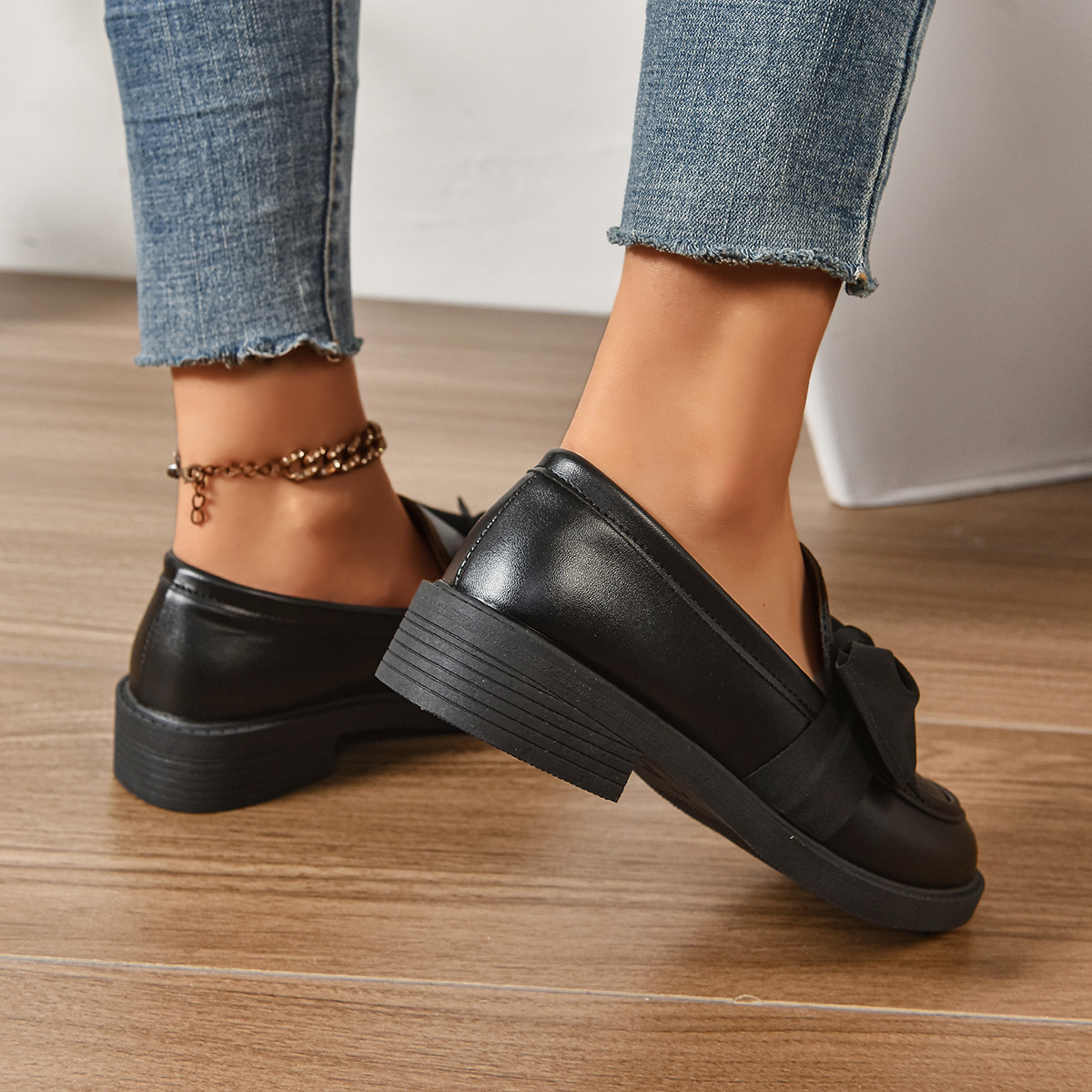 Британский стиль маленькие кожаные туфли 2025 Весна и Осень Новые универсальные балетки для женщин однотонные туфли с бантом толстый каблук лоферы для женщин