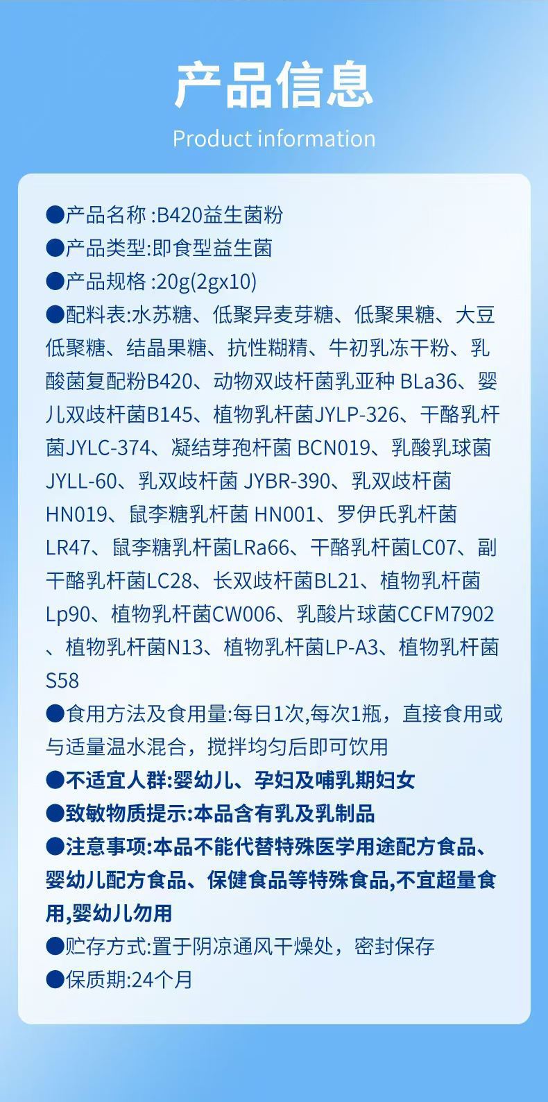 Пробиотиковый порошок B420 в маленькой синей бутылке, готовый к употреблению, пробиотические бактерии и пребиотики для улучшения работы желудочно-кишечного тракта, в наличии