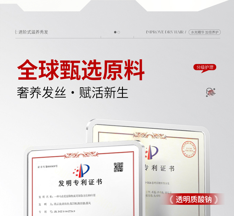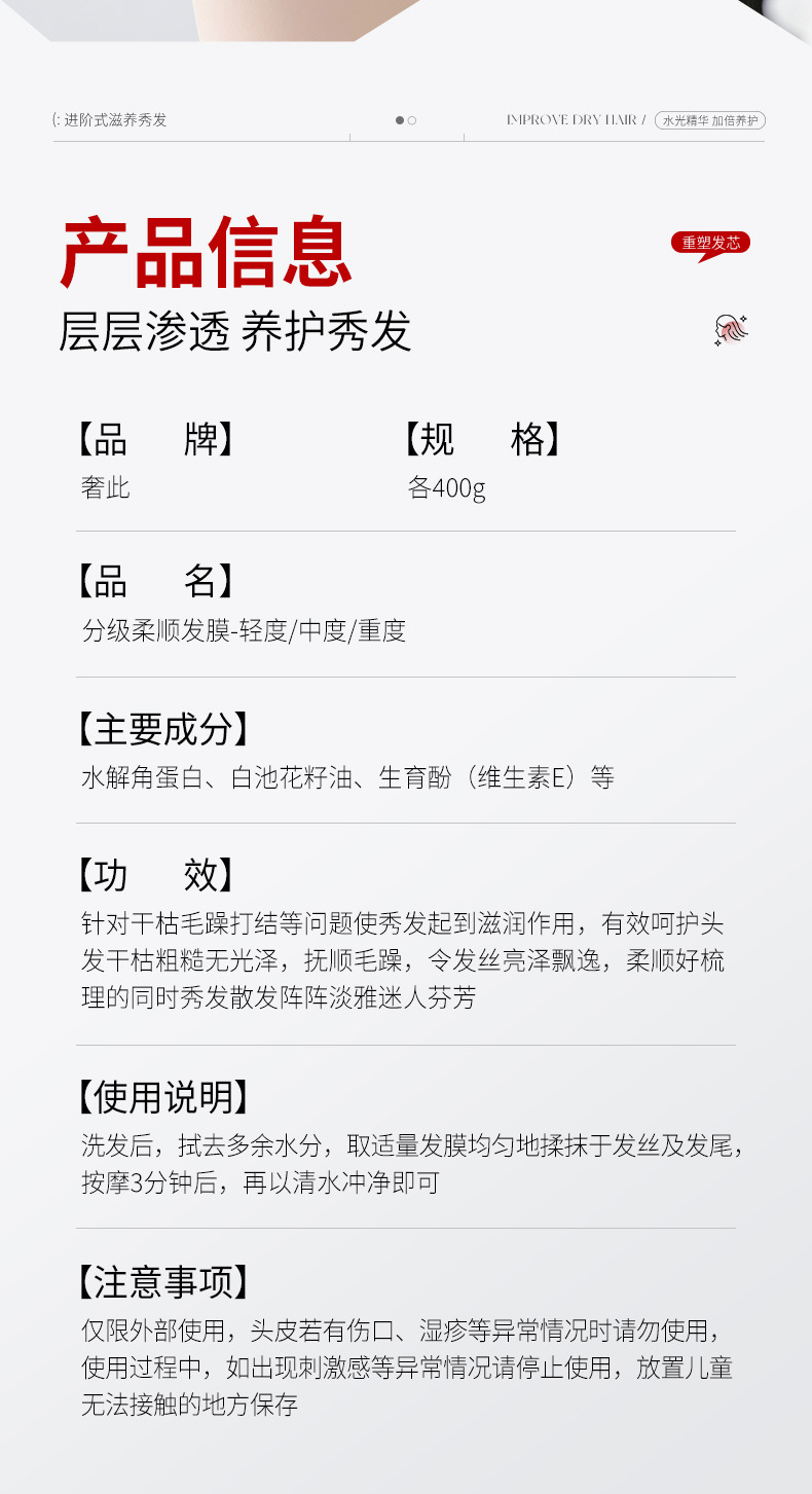 Эффективность Moisturizing, Hydration, Moisturizing and nutritious, Moisturize, Refreshing and oil control, Improve frizz, Curl protection after perm, Supple, Thick and fluffy