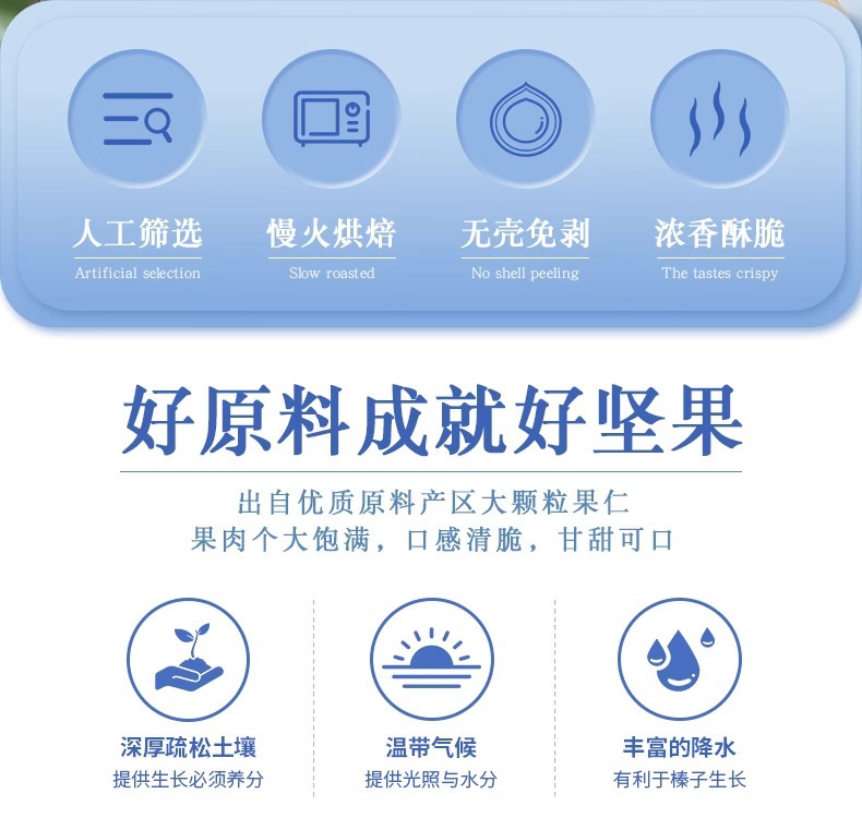 ![]() | Paper-skinned walnuts bagged net weight 250g | ¥9.9 / ≈ 121 ₽ | 99978 | 5933440744996 | |