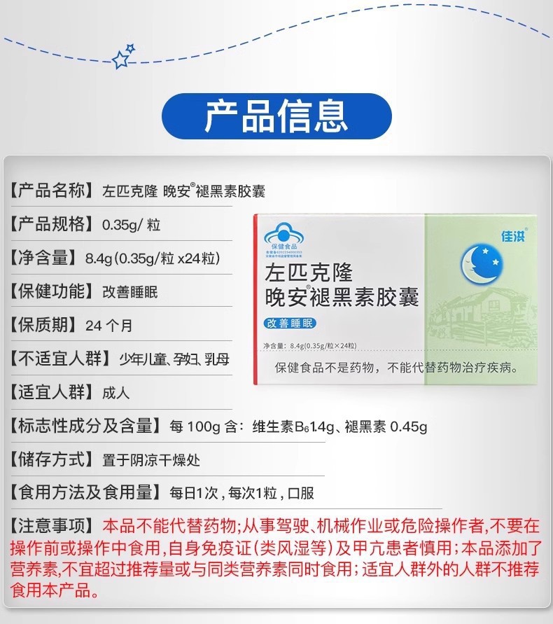 Капсулы мелатонина Jiahong Zopiclon Good Night, 24 капсулы для взрослых, среднего возраста и пожилых, добавка витамина B6 для улучшения сна