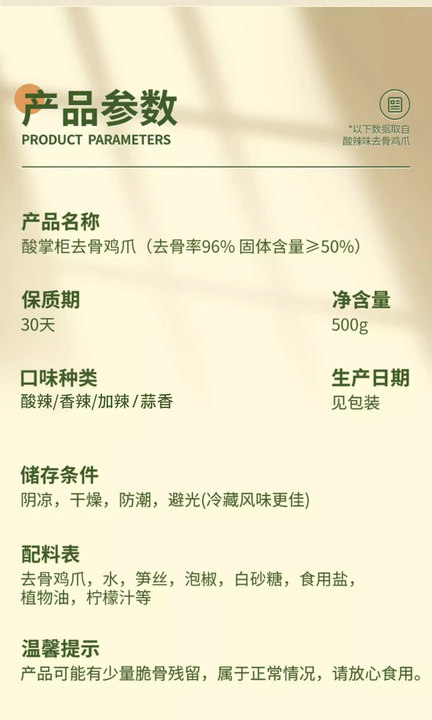 ![]() | Shopkeeper sour boneless chicken feet hot and sour 500g | ¥18.29 / ≈ 221 ₽ | 99405 | 6038707074112 | |
