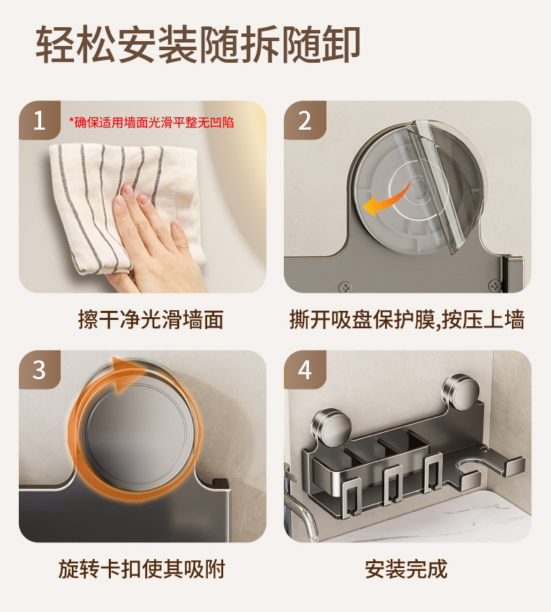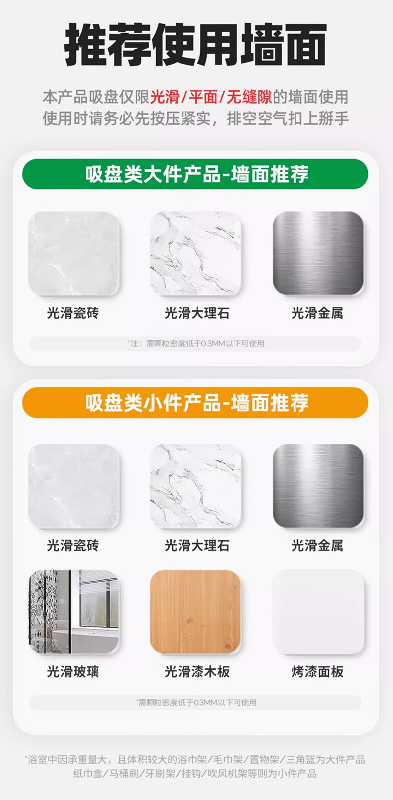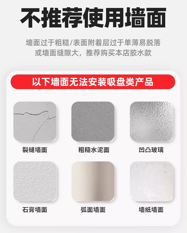 (3)墙面务必是平整光滑的玻璃、瓷砖等墙面。安装前将墙面擦干净保持干燥,有空气灰尘会不牢固,有条件可以用酒精擦拭一下