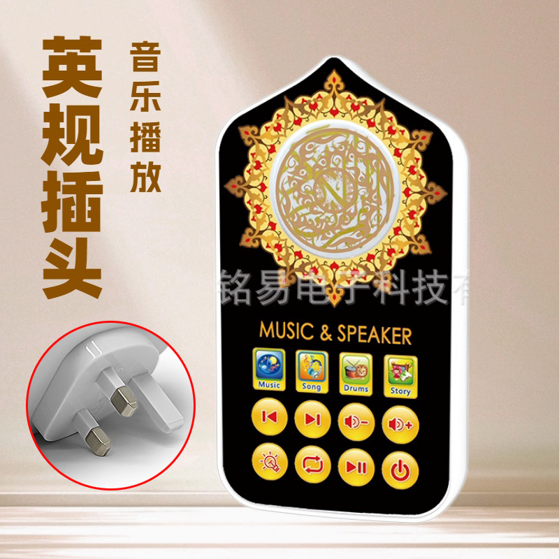 跨境新款播放器,内容丰富声音清晰,英规标准插头,直接插电使用,输入电压AC100-240V,7*24小时连续播放,七彩夜灯功能。