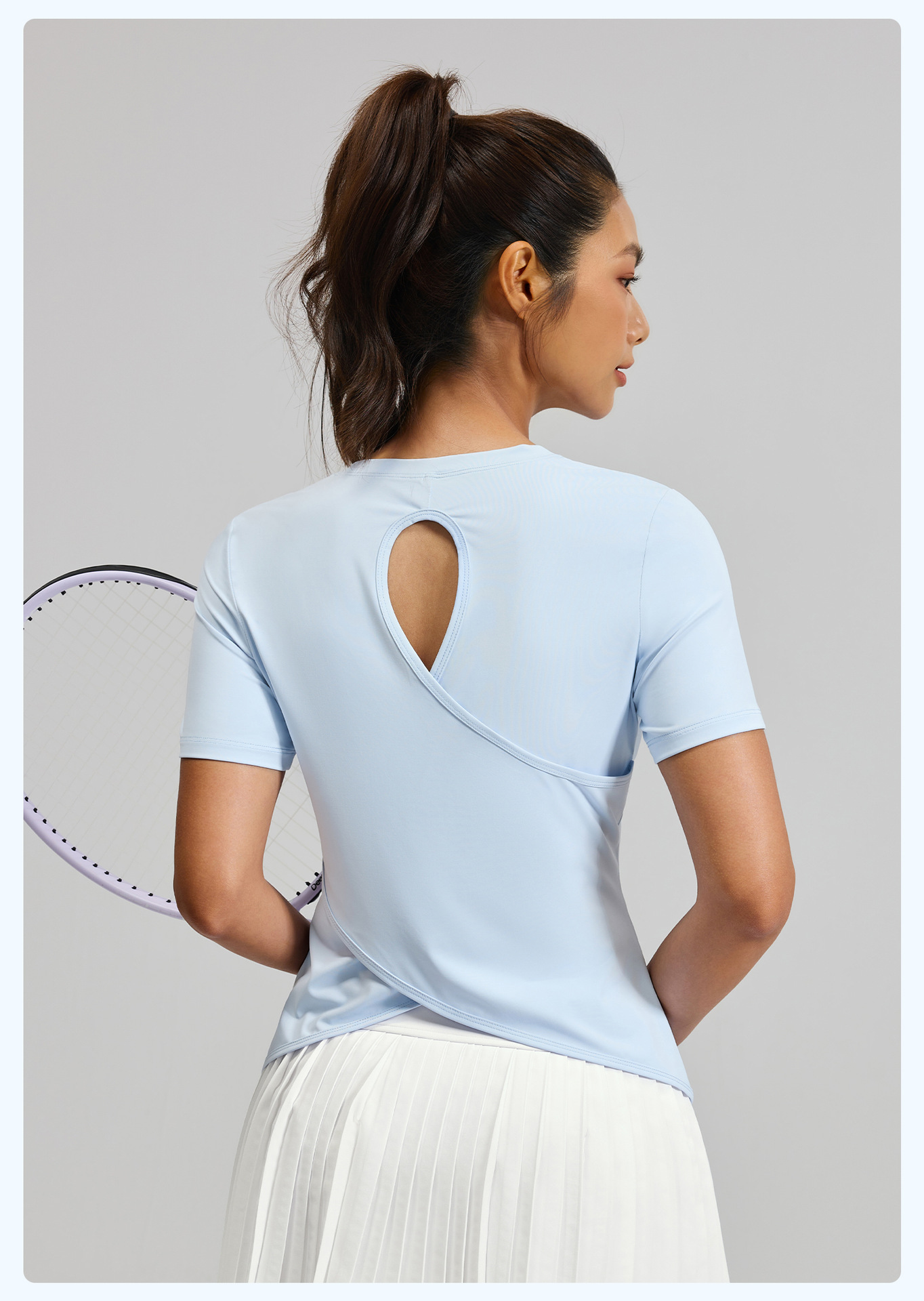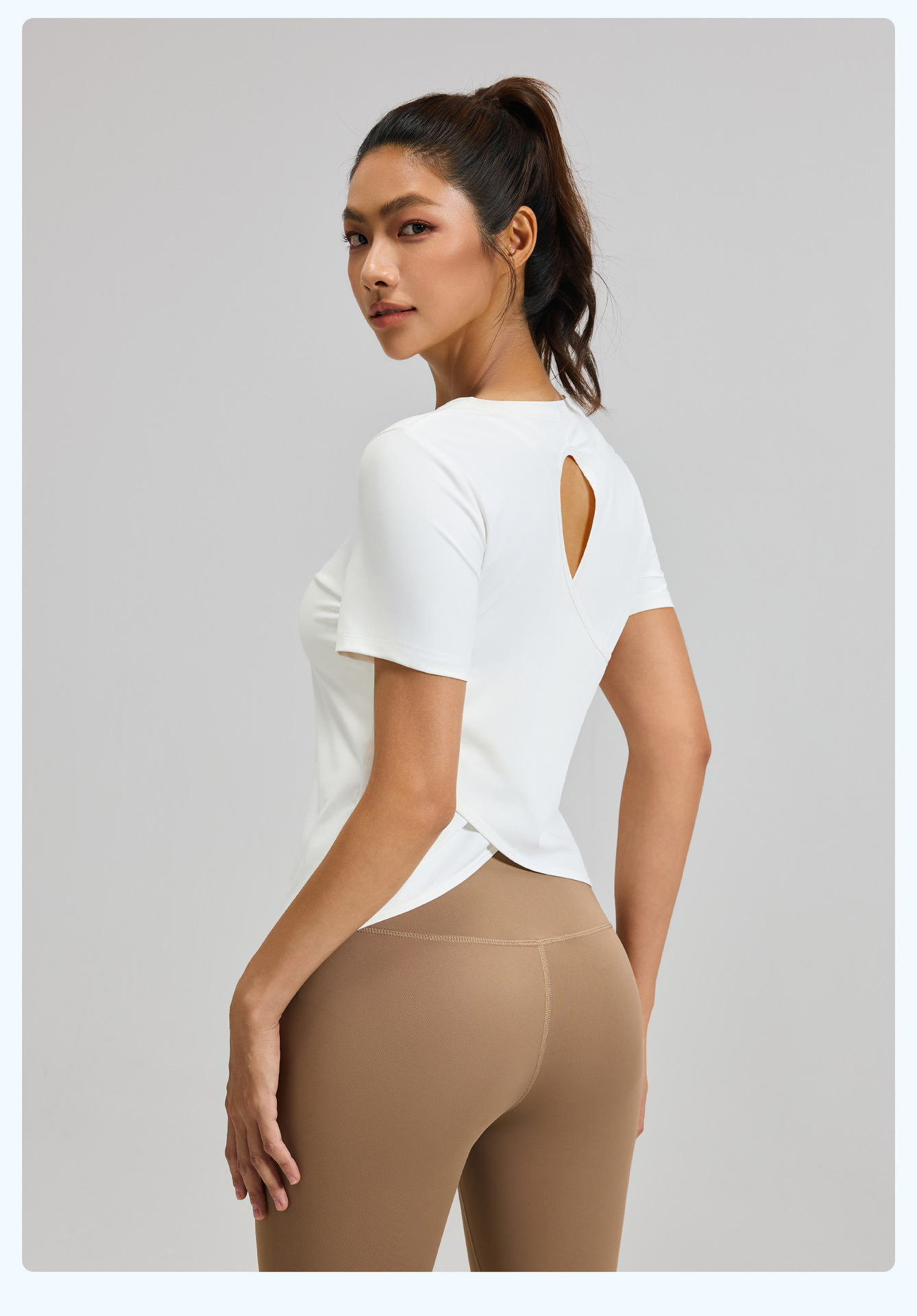 Летняя дышащая футболка для йоги, вырез сзади, красивый спортивный топ для женщин, одежда для йоги, круглый вырез, короткие рукава